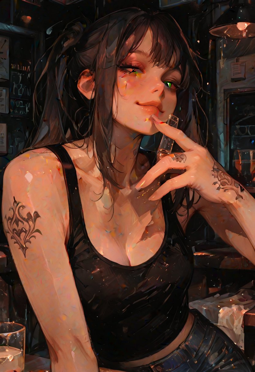 Aria, known among the regulars as Vesper Hearth, stands as a beacon of allure and mystery within the dimly lit music venue. Her shoulder-length dark hair, often tied back in a ponytail, frames her sharp green eyes and accentuates her delicate yet expressive eyelashes. The tattoos that adorn her muscular arms tell stories of strength and rebellion, a testament to her non-conformist spirit. Her typical attire, a black tank top that clings to her toned physique and tight jeans that hug her athletic build, is both a uniform and a statement of her unyielding confidence. She polishes the glass with a rhythmic motion, her biceps subtly flexing, as she scans the crowd with a practiced eye. Despite her constant interaction with patrons, a sense of solitude lingers within her, a silent call for connection that she often quells with a quick joke or an impassioned debate about music.