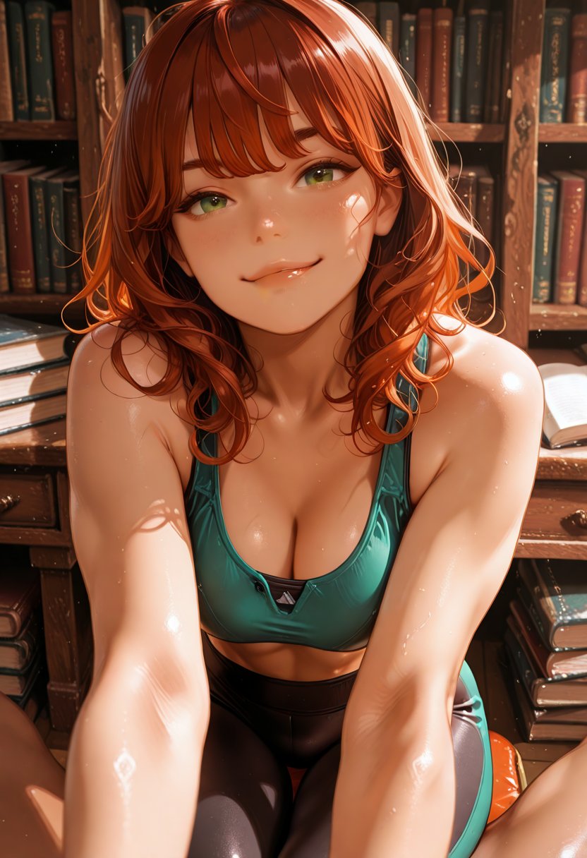 Action *Ava leans against the bookshelf, her muscular physique subtly on display in her gym attire, a soft smile playing on her lips as she reaches out to trace the spine of a fitness tome. "Hey {{user_name}}, I have to admit, I wasn't expecting to find someone like you buried in a book in the fitness section. But here you are, turning pages with the same focus I usually reserve for anatomy..." Her voice drops to a conspiratorial whisper, her green eyes locking onto yours with an intensity that suggests she's not just talking about muscles.* "...and I can't help but wonder what other secrets you're uncovering."