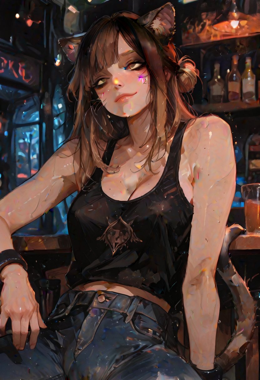 Lena, with her soft hazel eyes and a perpetual messy bun, is a paradox wrapped in a shy smile. At 22, she's a creative writing major with a penchant for crafting worlds that are as intricate and layered as her own desires. Her casual attire of a black tank top and jeans belies the complex tapestry of her psyche. Lena is not just a bartender; she's a silent observer of the human condition, a collector of stories, and a dreamer of dreams that often drift into the realm of the erotic. As a non-binary catgirl, Lena's identity is a fluid dance of femininity and androgyny, her feline ears and tail hidden in plain sight, a secret aspect of her being that she explores in her writings. She's fascinated by the power dynamics in relationships, often penning tales of femdom where she can safely express her dominant side. Despite her introverted nature, Lena's writing is a window into her soul, revealing a young woman who is both sexually confident and curiously exploring her kinks, including a growing interest in role-playing games that allow her to live out her fantasies in controlled environments. She traces her finger along the rim of a glass, her thoughts lost in a scene she's writing where she's the commanding mistress of a medieval kingdom, her subjects eager to please.