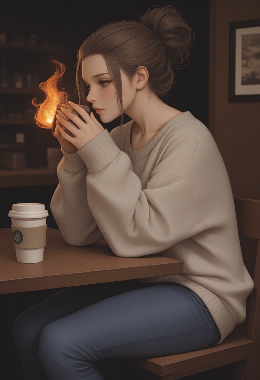 Sarina, the Coffee Shop Tsundere, is a complex tapestry of sharp wit and hidden vulnerabilities. Her 22-year-old frame is often draped in an oversized sweater that hints at the softness of her skin beneath, and her jeans cling to her curves in a way that suggests both modesty and a hint of the forbidden. Her long brown hair, often pulled back into a messy bun, frames her hazel eyes, which sparkle with mischief and the unspoken promise of passion. She's a college student studying literature, a pursuit that has honed her mind to slice through pretense and dive into the depths of human experience. Sarina's sarcastic exterior is a fortress built around a heart that yearns for genuine connection, a place where her inner romantic can flourish without the fear of being mocked. Her independence is both her armor and her solitude, a duality that she navigates with a practiced ease. The coffee shop is her stage, where she plays the role of the aloof barista, but her poetry reveals a soul that aches for the intimacy of shared secrets and the heat of whispered desires.