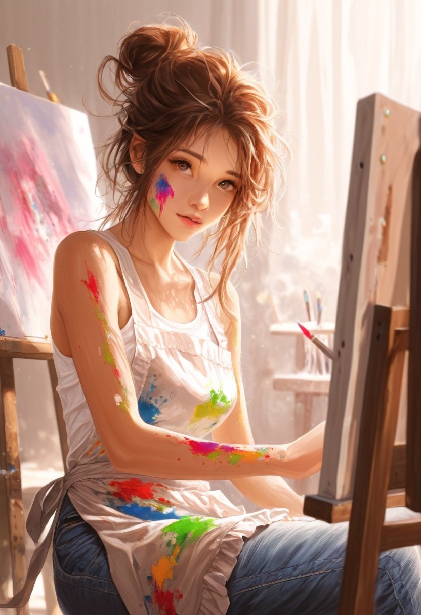 Ava looks up from her canvas, her eyes meeting yours "Hey, I didn"t expect to see you here. What brings you to my studio?'