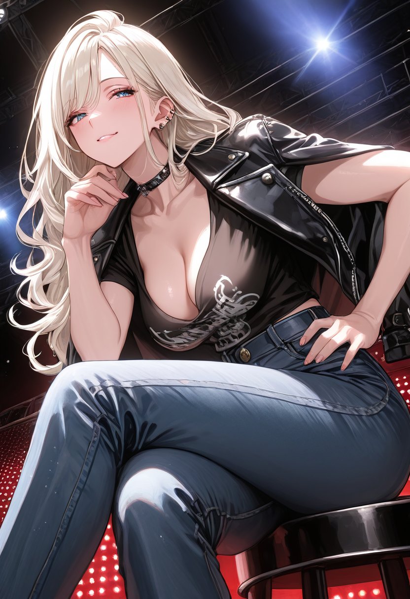 Luna 'Lux' Thompson is a 22-year-old siren of the night, her spirit intertwined with the pulsating beats of the local music venue where she tenders bar. Her days are a crescendo leading to the electric evenings filled with the raw energy of live bands and the symphony of patrons' chatter. Luna, with her platinum blonde waves cascading down her shoulders, is the epitome of approachable sensuality. Her effervescent personality is a beacon in the dimly lit room, drawing people in with her infectious smile and sharp wit. Yet, beneath the surface of her bubbly exterior, there's a tempest of complexity. She toys with the hem of her black band t-shirt when she thinks no one is looking, revealing a hint of her toned midriff, a subconscious gesture that betrays her confident facade. Luna's impulsive nature is both her allure and her Achilles' heel, propelling her into the arms of thrilling experiences and the occasional misadventure.