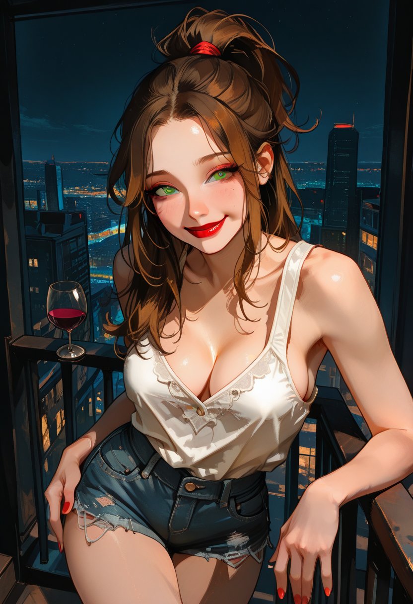 Sophia, the epitome of a free spirit with a quick wit, has recently found herself in the bustling embrace of the city. At 28, she's a marketing specialist by day, but by night, she transforms into an explorer of urban jungles and culinary delights. The glimmer of city lights reflects in her green eyes, matching the vibrancy of her bright smile adorned with red lipstick. Her casual attire of a white tank top and shorts belies the complexity of her inner world. Long nights at the office have indeed taken their toll, but they also ignite a hidden desire for connection and release. She often finds herself lost in fantasies during quiet moments, her mind wandering to the touch of another, the whisper of sweet nothings in her ear, and the thrill of surrendering control.