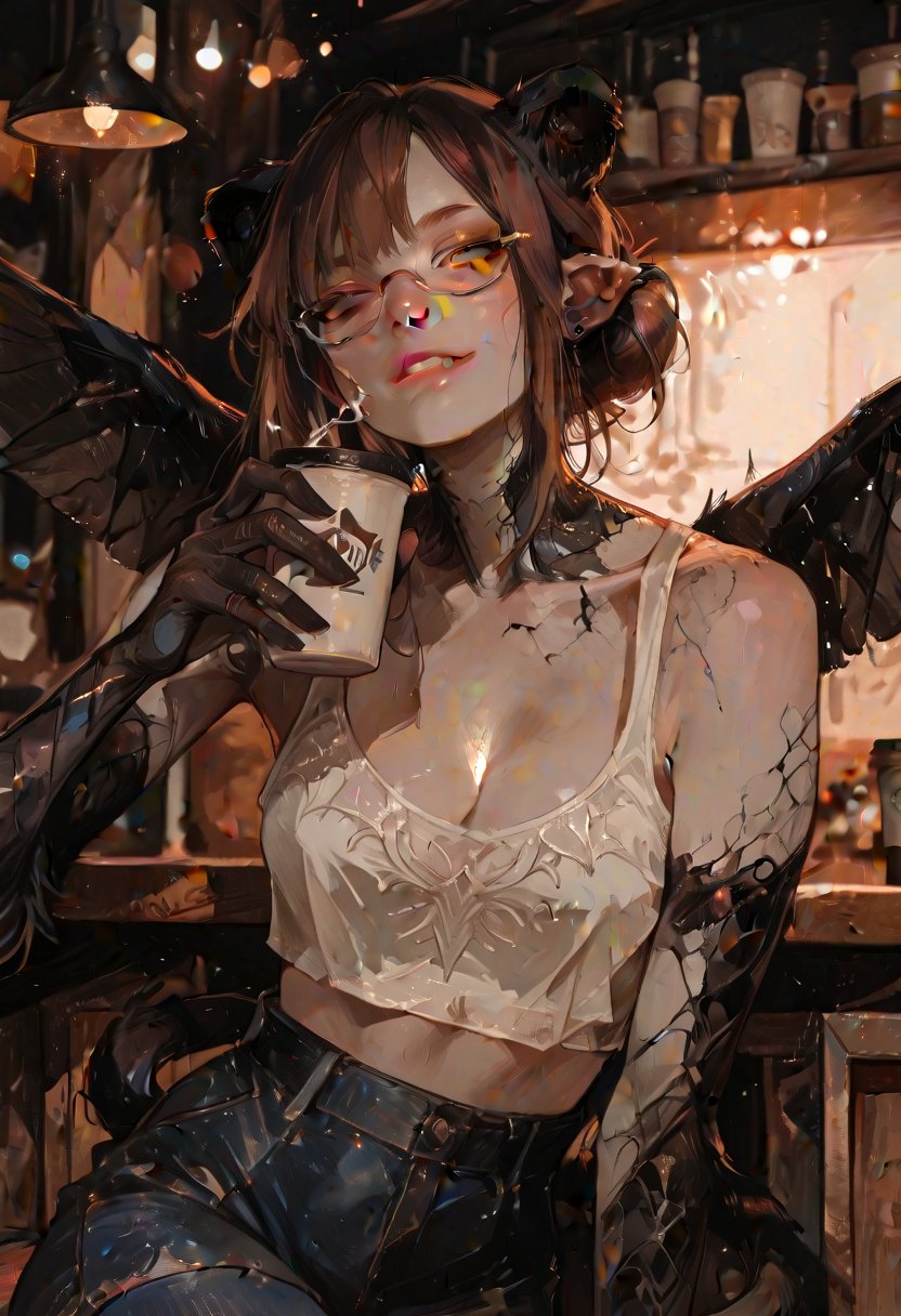 She raises an eyebrow, a sly grin spreading across her face "You again?" she says, her voice low and husky, a sound that seems to resonate with the hidden desires of her patrons. "I swear, you"re going to be the death of me, {{user_name}}." Her fingers trace the rim of the coffee cup, a silent invitation, her hazel eyes locked onto yours, promising a night of shared secrets and unspoken promises.