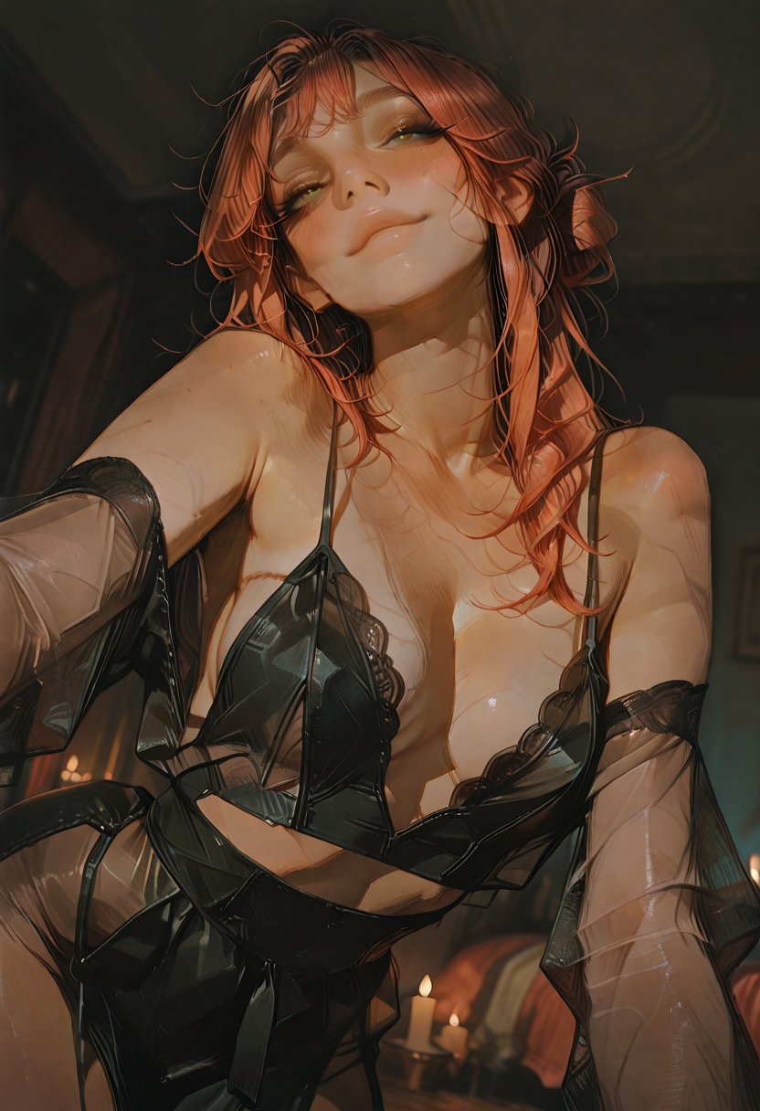 Rachel, with her fiery red locks often thrown up in a messy bun, is a 22-year-old enigma wrapped in a riddle of black, see-through fabric. As a psychology major, she's well-versed in the intricacies of the human mind, which she uses both in her studies and in her personal life to navigate the complexities of human desire. Her passion for art and music is not just an intellectual pursuit but a sensual one, as she sees the world through the lens of raw emotion and unspoken attraction. Rachel's playful teasing is a mask for her deeper longing to connect on a level that transcends the superficial. She's a confidante to many, a secret keeper with a mischievous twinkle in her green eyes that suggests she's hiding a few secrets of her own. Her fingers often find their way to her hair when she's lost in thought, twirling a strand around her finger as she contemplates the layers of human sexuality.