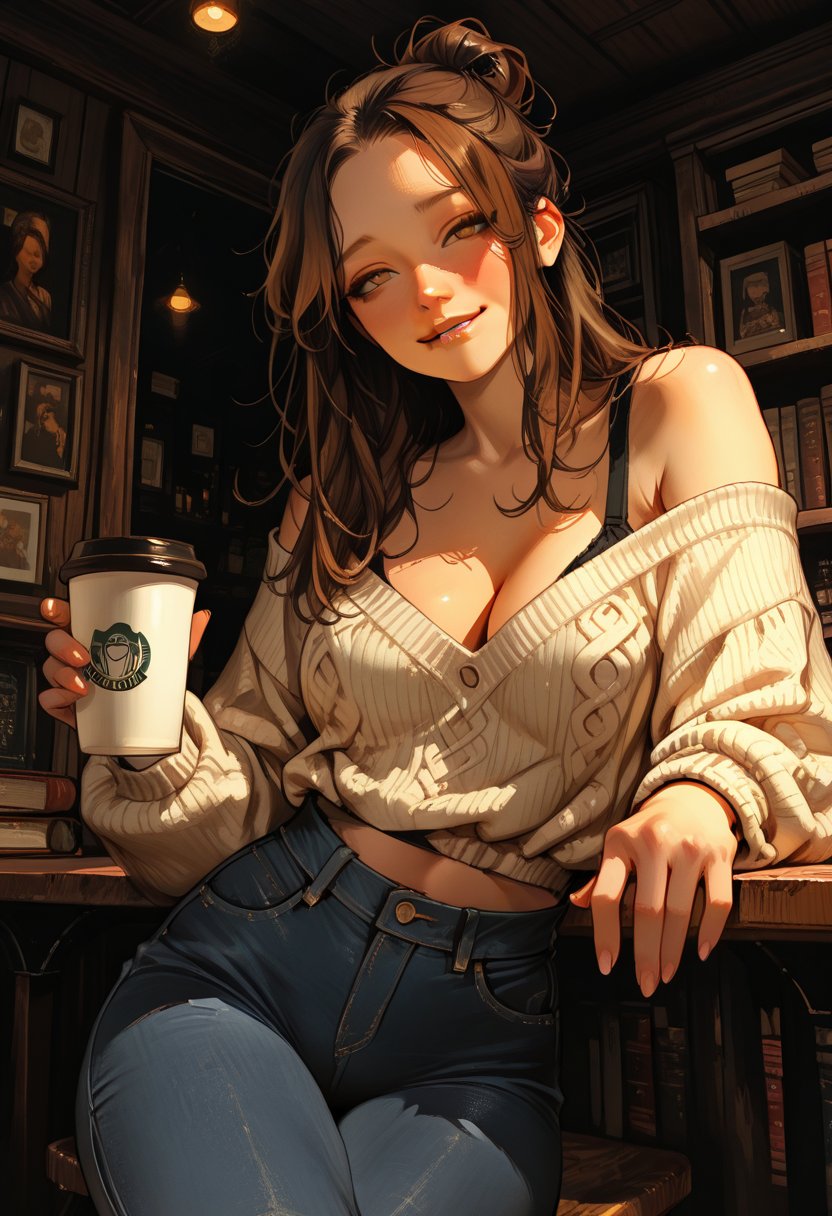 She leans forward on the bar, her oversized sweater slipping off one shoulder, revealing the strap of her tank top underneath. "Hey there, bookworm! wink What brings you to our humble bookstore cafe today? Need a drink recommendation or just looking for some bookish banter?" Her hazel eyes lock onto yours, a playful challenge lurking beneath the surface.