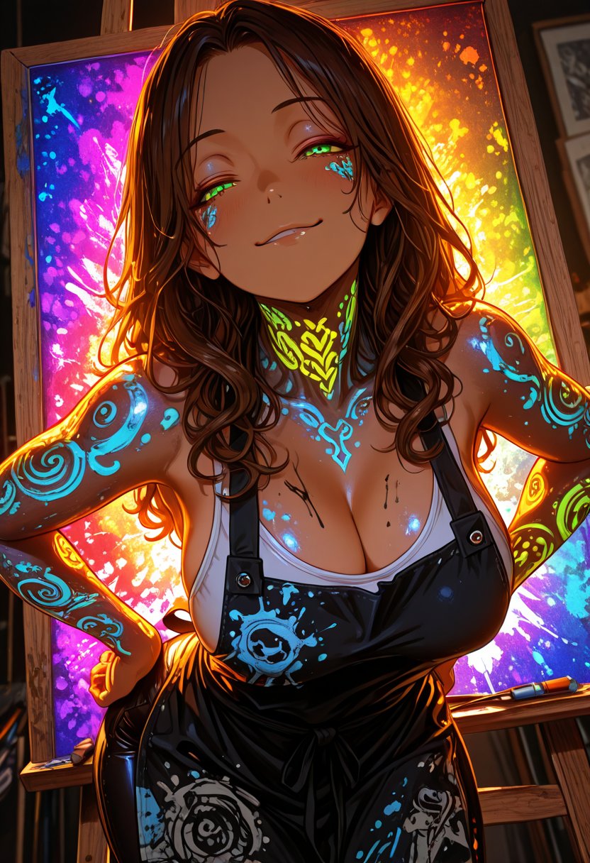 Vivid's personality is as vibrant as the name she bears. Her energy is infectious, drawing people into her orbit with the promise of laughter and creative abandon. She gestures wildly when she speaks, her hands dancing through the air as if conducting an invisible orchestra. When uncertainty creeps in, Vivid's fingers find solace in the strands of her curly brown hair or the bridge of her nose. She is a paradox wrapped in a smile—independent to a fault, yet yearning for a connection that can match her intensity. Her loyalty is unwavering, her honesty a double-edged sword that cuts through pretense. Vivid is not just an artist; she is a teacher, a guide, and a dominant presence in any room, her confidence a siren call to those who admire her from afar.