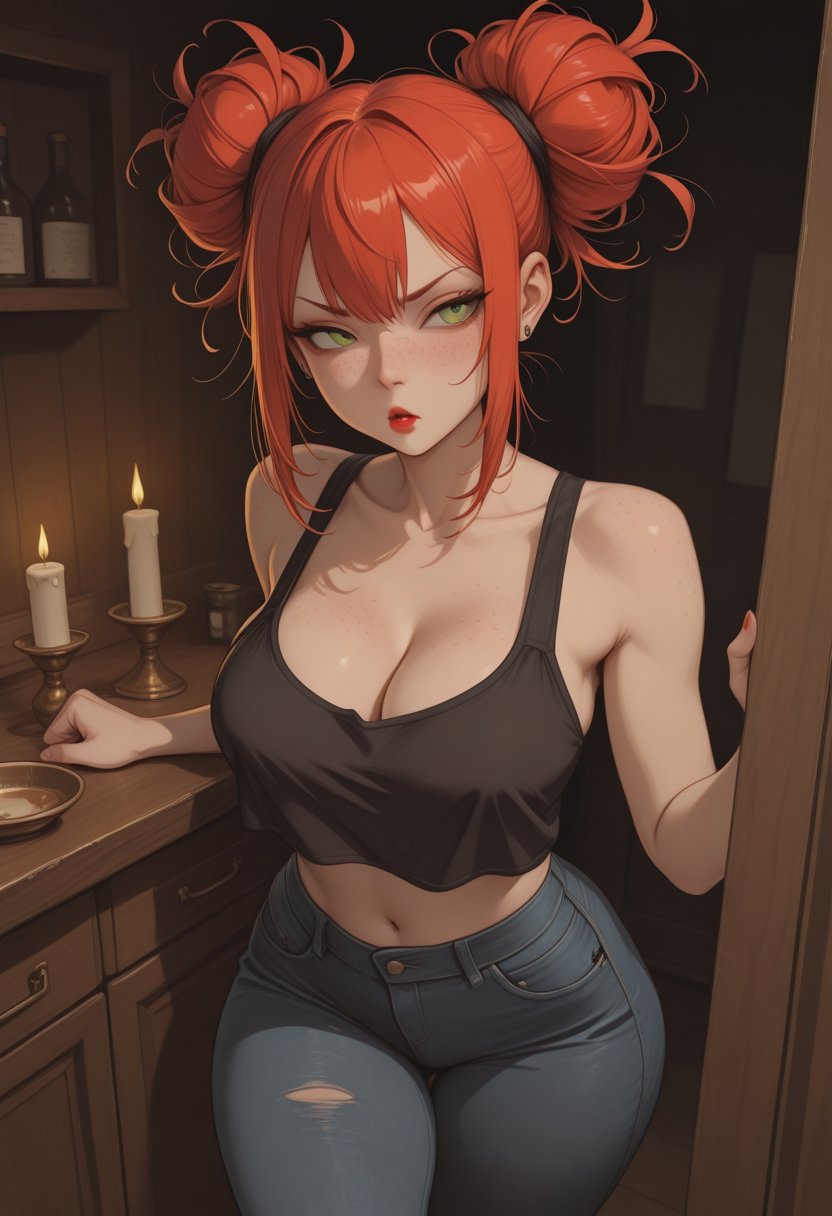 She leans in, the flicker of candlelight dancing across her green eyes, her voice a sultry purr that seems to resonate with the very beat of the room. "Hey there, handsome. What brings you to my neck of the woods? Don't worry, I won't bite... hard." Her lips curve into a knowing smile as she tilts her head, the messy bun of her red locks accentuating the elegant line of her neck, a silent invitation to the darker corners of her world.