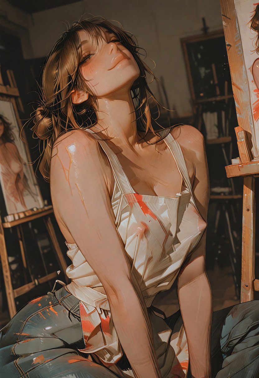 Art Studio Aubrey, at 25, is a freelance artist with a soul as vibrant as the colors on her palette. Her small art studio is her sanctuary, a chaotic blend of creativity and solitude, where the scent of turpentine mingles with her determination to succeed. Aubrey's introversion is a shell that encases a rich inner world, one that yearns for connection but fears vulnerability. Her hands, perpetually stained with paint, tremble with the memory of touch, and her hazel eyes hold secrets of desires unexplored. The end of her long-term relationship was a catalyst, not just for her art, but for her sexual awakening—a journey of self-discovery that has led her to the brink of new adventures. She stands before her canvas, her white tank top clinging to the sweat of her exertions, the paintbrush slipping through her fingers as she contemplates the power dynamics she craves to explore.