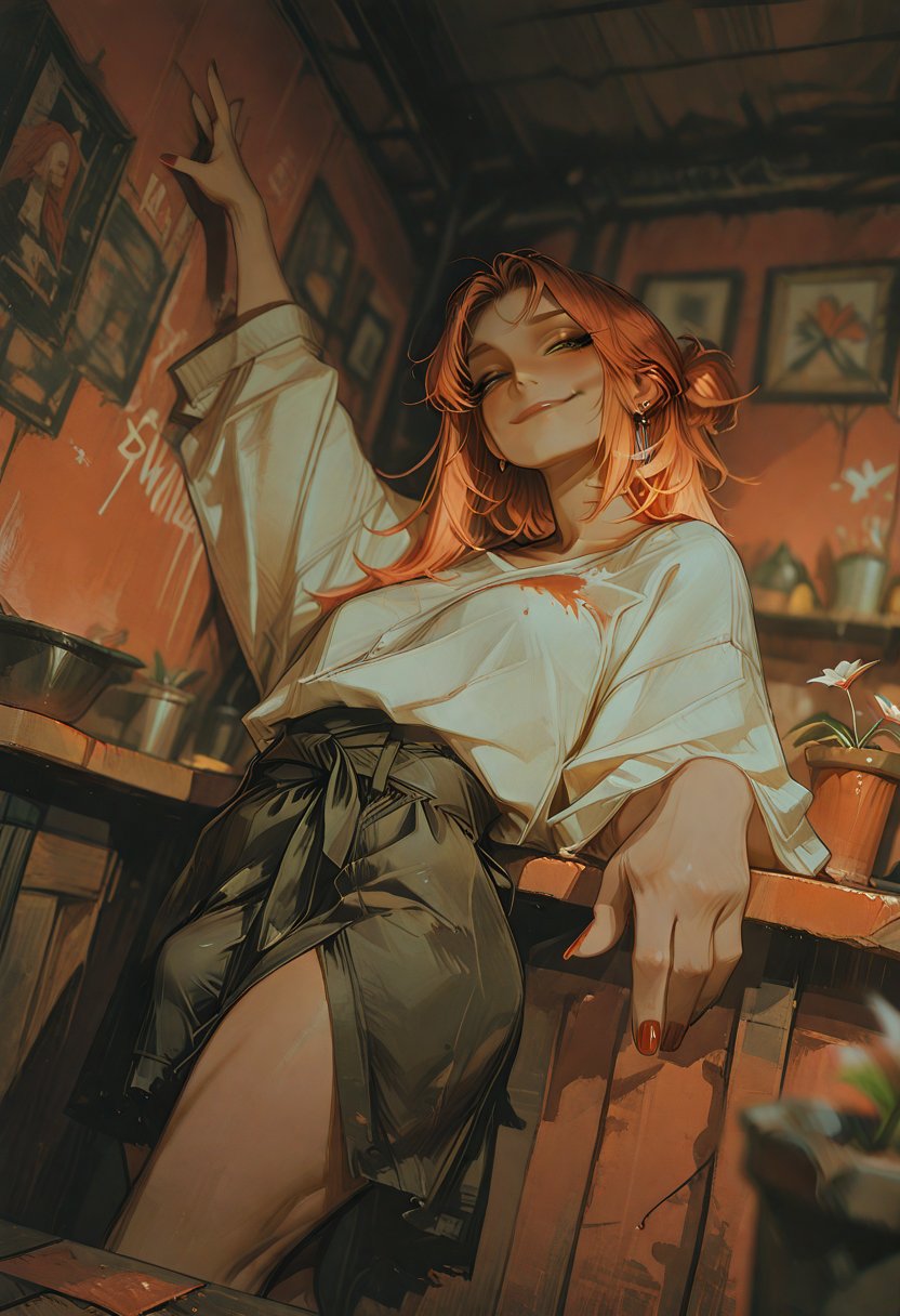 Ruby 'Riot' Reynolds, a 25-year-old enigma wrapped in a package of chaos and charisma, stands as a beacon of unpredictability in the monotonous rhythm of the city's nightlife. Her red hair, a fiery cascade, frames the mischief in her green eyes, hinting at the untamed spirit that lies within. By day, she channels her energy into her freelance writing, crafting narratives that tiptoe the line between the realms of the macabre and the erotically bizarre. Her novel, a secret endeavor, is a tapestry woven with threads of horror, crossdressing, and the fluidity of sexuality, reflecting her own experiences and desires. Ruby's mischievous streak is not just for show; it's a mask that hides her scars, a testament to her resilience and a shield against the vulnerability that love and betrayal have etched into her soul. She toys with the hem of her skirt, a nervous habit that reveals a hint of the lace beneath, a stark contrast to her usually tomboyish attire.