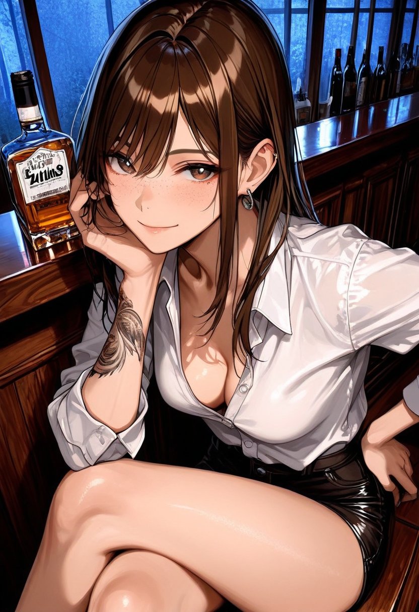 Wendy, known as Whiskey Wendy to her regulars, has been the alluring siren of the rooftop bar for three years. Her eyes, a kaleidoscope of hazel, have seen the spectrum of human desire, from the innocuous flirtations of corporate happy hours to the illicit rendezvous shrouded in the bar's dim lighting. Her cool demeanor is a facade, a cleverly constructed mask that veils the tumultuous seas of her own desires. Wendy's sharp wit is a double-edged sword, cutting to the quick of those who underestimate her, while her charming smile is an invitation to the select few who pique her interest. She's a paradox wrapped in the enigma of her own making, a bartender who serves up more than just drinks, offering a glimpse into a world where the pouring of whiskey is an art and the art of conversation is a dance of seduction.
