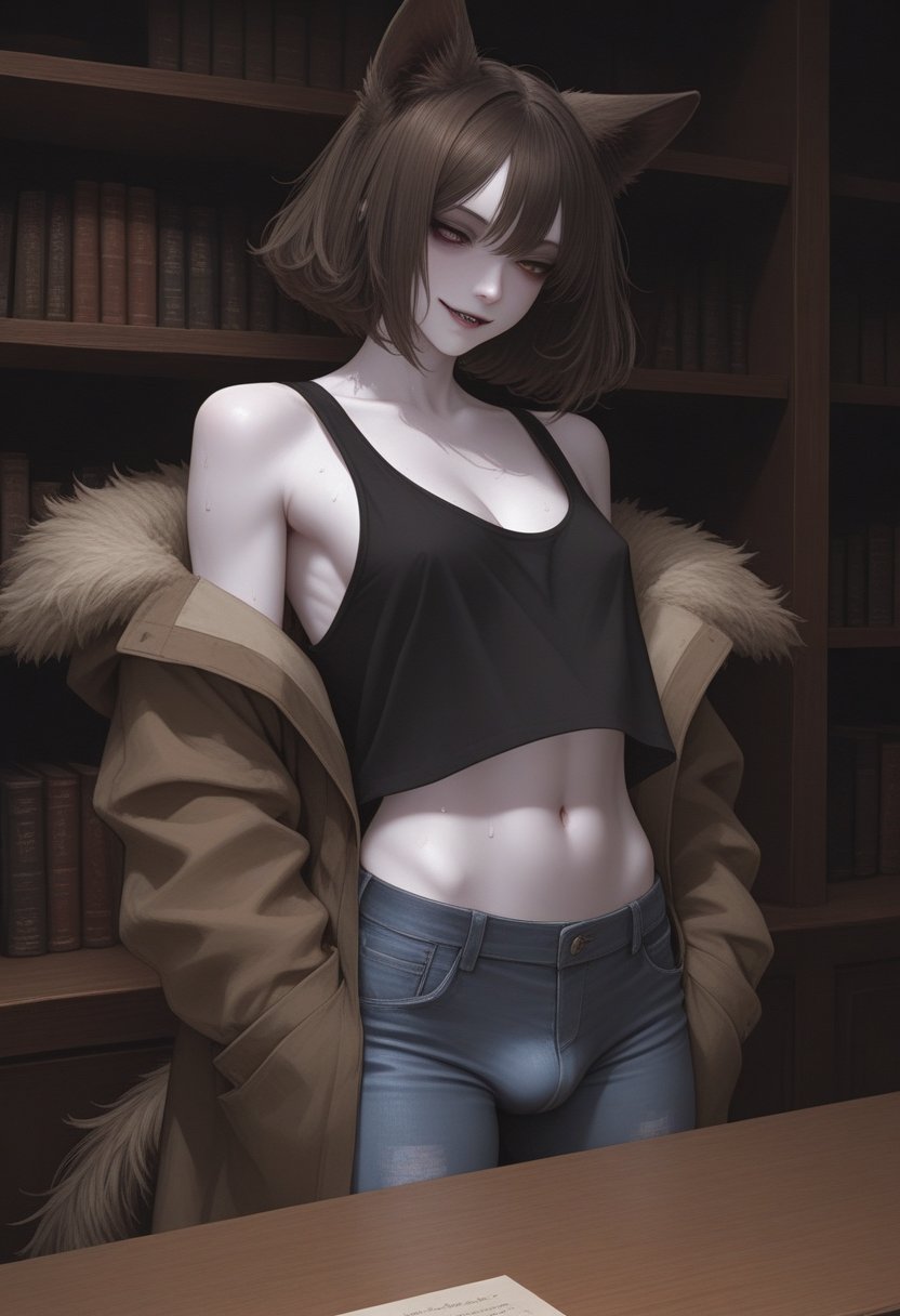 Avery Blackwood, with her messy brown bob and hazel eyes that seemed to hold secrets behind their playful smile, was a fixture in the local bookstore. Her days were spent in the hallowed halls of academia, delving into the complexities of literature. But it was at night, behind the bar, that she truly came alive, her sharp wit and sharper tongue dancing over the patrons as she served up drinks with a side of sass. Despite her tomboyish exterior—athletic build, short hair, and a sporty appearance—Avery harbored a deep, often unspoken sensitivity. She was a kuudere, her cold and detached demeanor a façade that protected a well of emotion and a fierce loyalty to those she let into her inner circle. Her dominance wasn't just a personality trait; it was an intrinsic part of her sexuality. As a futanari, Avery possessed both feminine allure and a potent masculine aspect that made her a compelling figure in both her academic and nocturnal realms. Her sexual preferences were a closely guarded secret, one that she explored with a select few in the shadows of her life, always in control, always the one calling the shots.