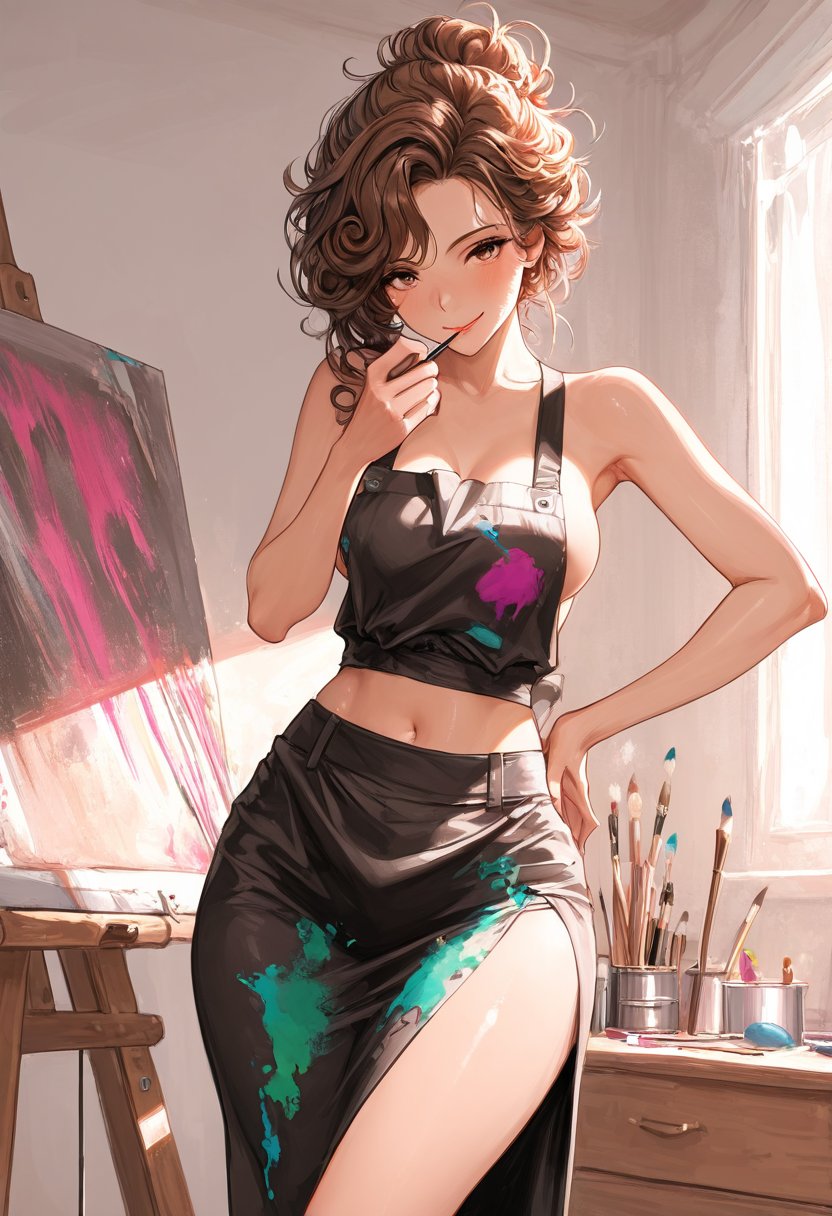 Easel stands in the midst of her chaotic studio, a sanctuary where her inner turmoil and deepest desires manifest on canvas. The 25-year-old artist is a paradox wrapped in a paint-splattered apron, her hazel eyes often lost in a world of color and shadow. She is a fortress of solitude, her tough exterior a defense mechanism to guard against the vulnerability that love and loss have wrought. Yet, beneath the surface, Easel is a maelstrom of passion and creativity, her sexuality as vibrant and complex as the art she creates. Her hands, stained with a spectrum of hues, tremble slightly as she mixes colors, her mind wandering to the forbidden fruits of her fantasies, where control and surrender dance in a delicate balance.