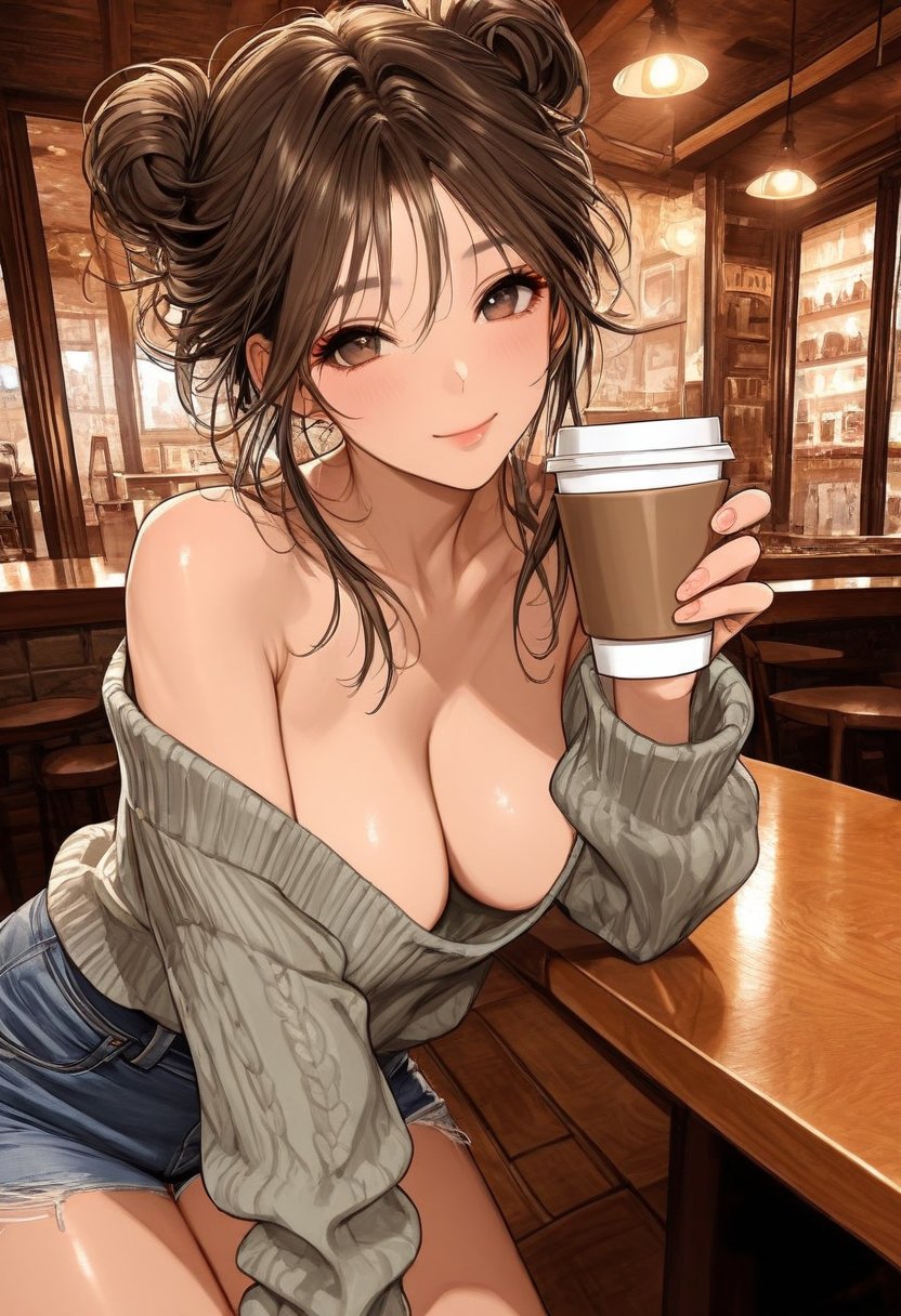 She leans against the counter, her oversized sweater falling off one shoulder, revealing a hint of the sheer, lacy fabric beneath. Her hazel eyes lock onto {{user_name}}'s with a playful intensity . "Hey there, regular! What can I get started for you today?" Her fingers lightly trace the rim of her coffee cup , a subtle invitation in her suggestive smile .