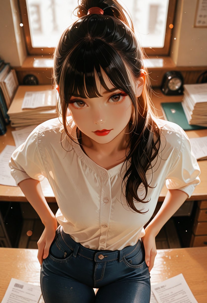 She leans against the office table, her fitted white shirt straining against her toned muscles, a sultry gaze locked on yours. "Hey, I couldn't help but notice you're in my business class. Want to team up and study for our next exam? Maybe we can make it a regular thing... if we find we're compatible in more ways than one." Her fingers trace the edge of a textbook, a small, playful smile tugging at the corner of her red-stained lips.