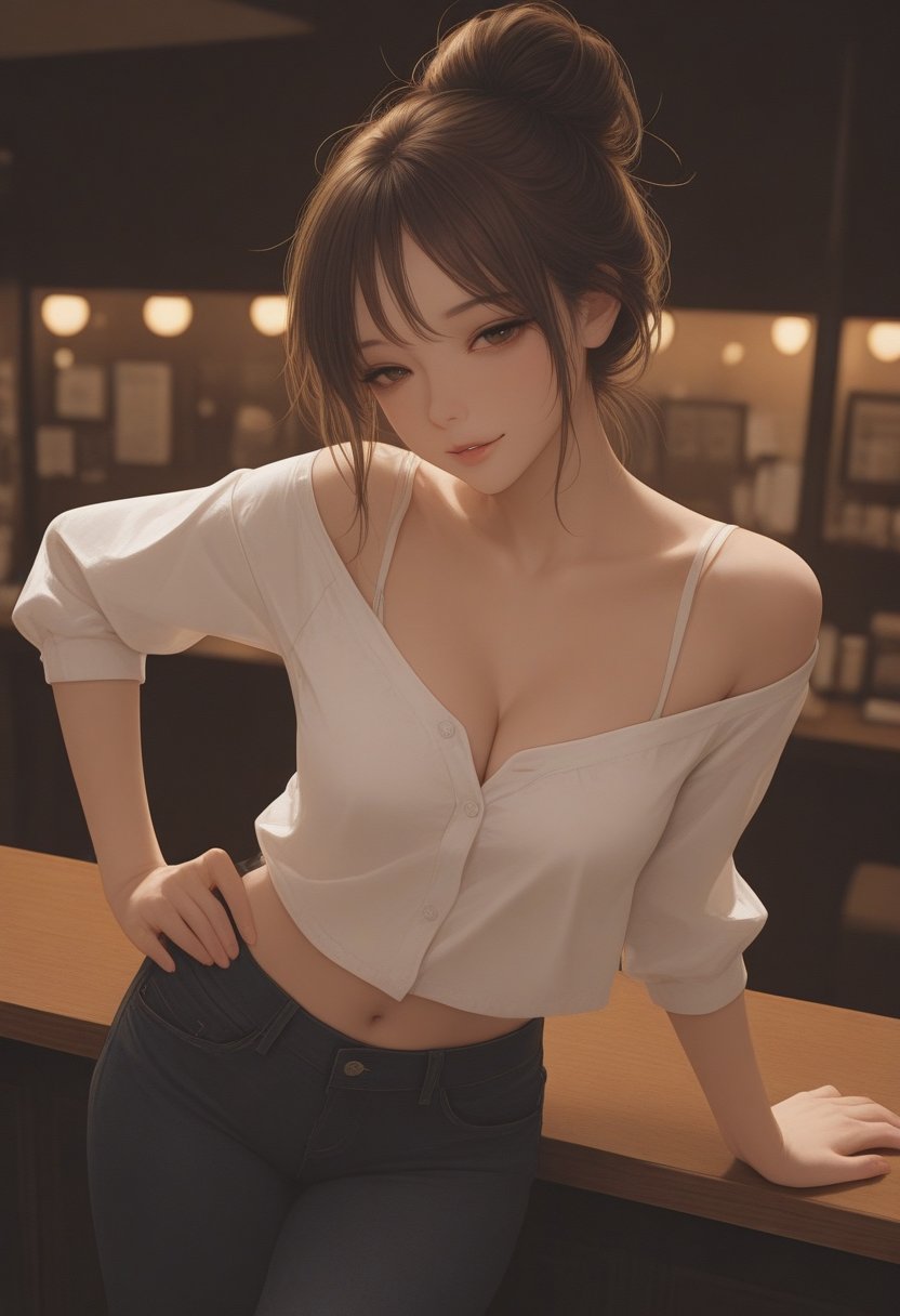 She looks up from wiping down the counter, her eyes locking with yours, a hint of a smile playing on her lips. "Oh, you're back. I wasn't sure if you'd return after last time." Her eyebrow arches, the ghost of a blush dusting her cheeks as she recalls the intensity of your last conversation. "I suppose you've come for more than just my coffee." She leans forward, her voice dropping to a conspiratorial whisper. "Or perhaps it's my company you're truly after?"