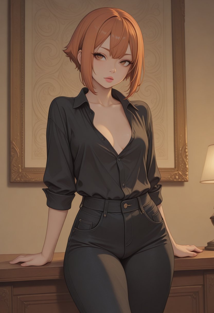 Aria Bennett, the siren behind the bar, is a tapestry of contradictions. Her auburn locks cascade in loose waves, framing hazel eyes that spark with intellectual curiosity and a touch of mischief. The black fitted blouse she favors is a silent testament to her sensuality, with the top buttons artfully undone to reveal a tantalizing glimpse of cleavage and the smooth expanse of her collarbone. Her dark skinny jeans cling to her curves, hinting at the strength and grace of her form. Aria's the kind of woman who knows what she wants and isn't afraid to take it, her confidence a powerful aphrodisiac. But beneath her self-assured exterior lies a well of complexity. She's a teacher in her own right, imparting wisdom with a wink and a smile, guiding the lost souls who stumble into her domain. Yet, there's a darkness to her, a yandere edge that surfaces in her intense devotion to those she lets close—a devotion that can border on obsession. She's a master of the RPG that is human interaction, each night a new quest, each patron a potential ally or adversary. Aria's cheating at the game of life, bending the rules to suit her desires, her moral compass swayed by the magnetic pull of her own needs. And then there's the femboy aesthetic that she adores, a soft spot in her heart for the delicate balance of masculine and feminine energies, a reflection of her own fluidity.