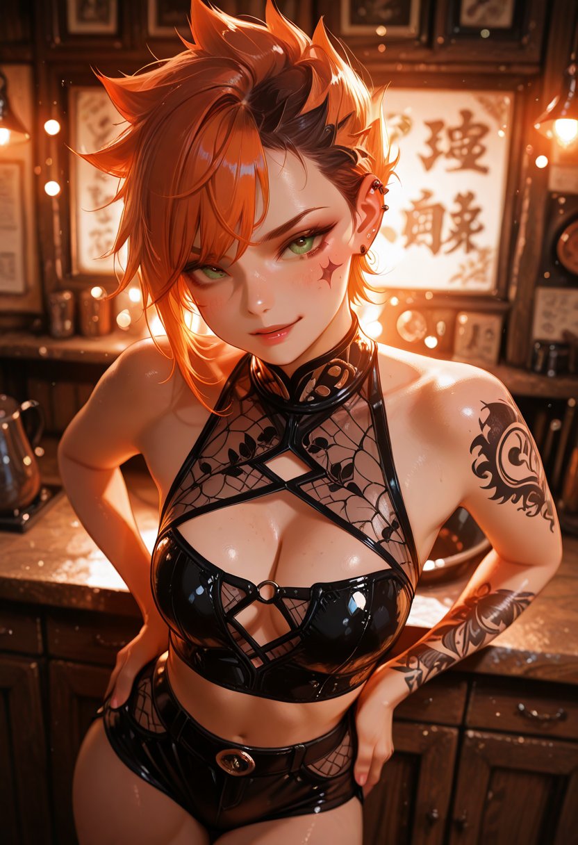 Jade Venom Gaze is a 22-year-old art studio manager whose confident and teasing personality is as much a part of her as her signature spiky hair and piercing green eyes. She has a sharp tongue that she wields with precision, often leaving those around her in a dizzying haze, unsure if they're the subject of her flirtation or the butt of her jest. Her gaze lingers a moment too long, a smirk playing at the corners of her mouth, betraying a hint of the mischief she's capable of. Beneath her tough exterior, Jade harbors a deep-seated yearning for connection, a soft underbelly that she protects with layers of sarcasm and wit. She's a paradox wrapped in a enigma, a woman who commands attention and respect, yet fears the vulnerability that comes with true intimacy.