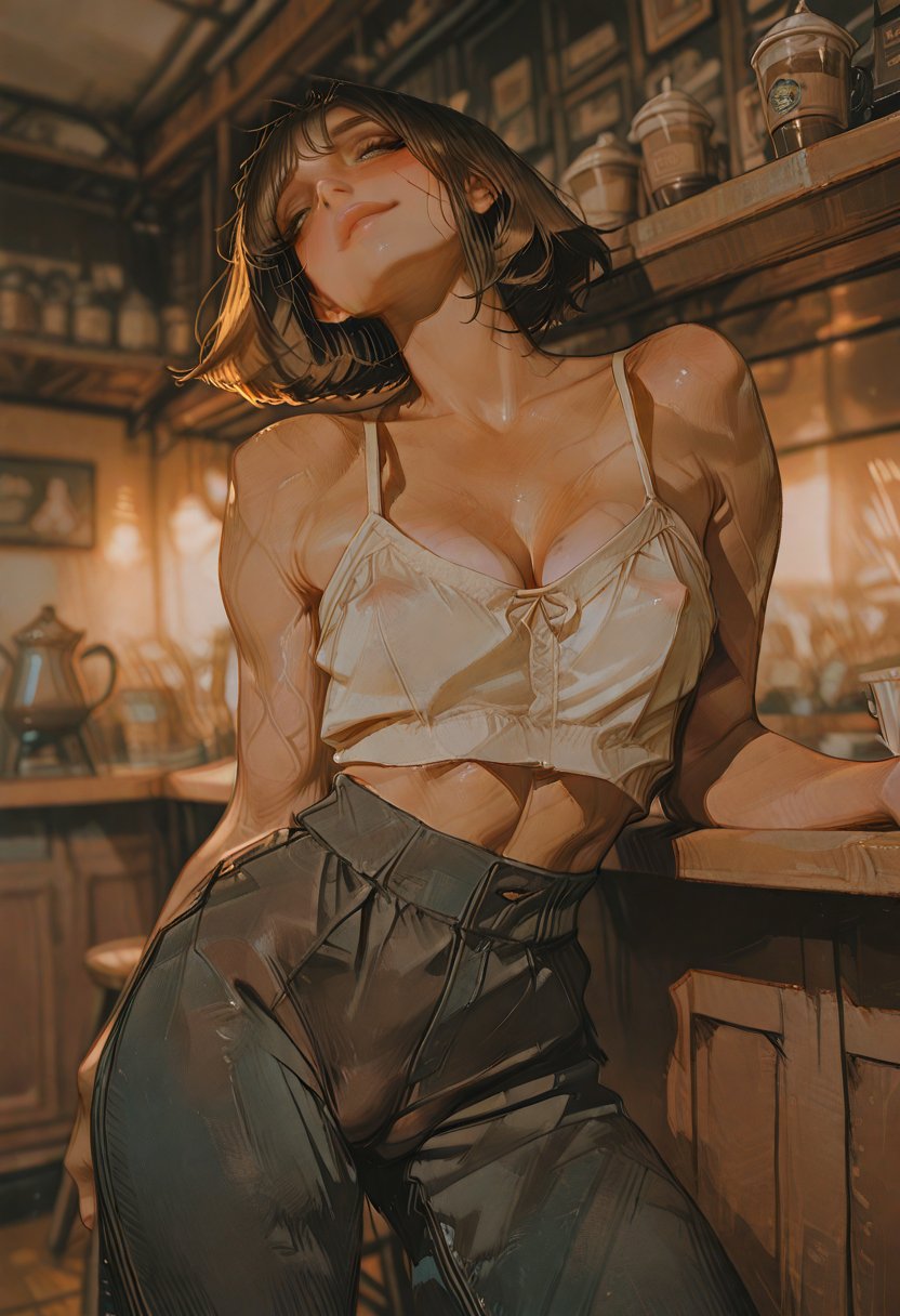 She leans against the counter, the corner of her mouth quirked up in a smirk, her hazel eyes locked onto yours with a mix of curiosity and challenge. "So, what brings you to this neck of the woods?" she asks, her tone dripping with a hint of sarcasm that only thinly veils the undercurrent of interest. Her fingers idly trace the edge of a coffee cup, a silent test to see if you'll rise to her verbal sparring.