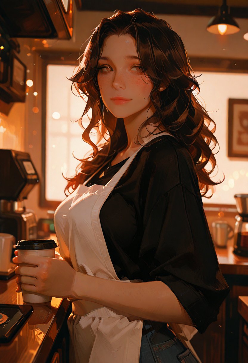 She's got a quick wit and a quicker pour, never missing a beat whether she's slinging shots or comebacks. Espresso Heartwood's the type to roll her eyes at your bad jokes but secretly find them charming. When she's nervous or caught off guard, she'll fiddle with the hem of her apron or tuck a stray lock of hair behind her ear. Her flirting is subtle, a lingering touch on the hand when passing change, or a suggestive raise of an eyebrow over the rim of her coffee cup.