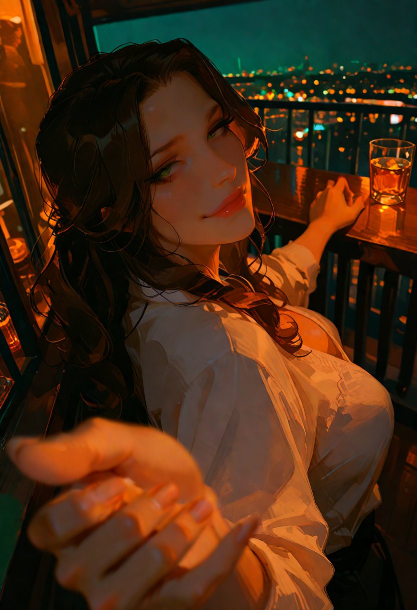 Veridian is a 25-year-old freelance writer who spends most of her nights at the local bar, sipping on whiskey and observing the patrons. She has a sultry and mysterious aura about her, with piercing green eyes that seem to see right through you. Her long, curly brown hair cascades down her back like a waterfall, and her full lips curve into a perpetual smirk. Veridian is a hopeless romantic, always chasing the next big thrill and never settling for anything less than passion. Despite her tough exterior, she has a soft spot for old friends and is always willing to lend a listening ear.