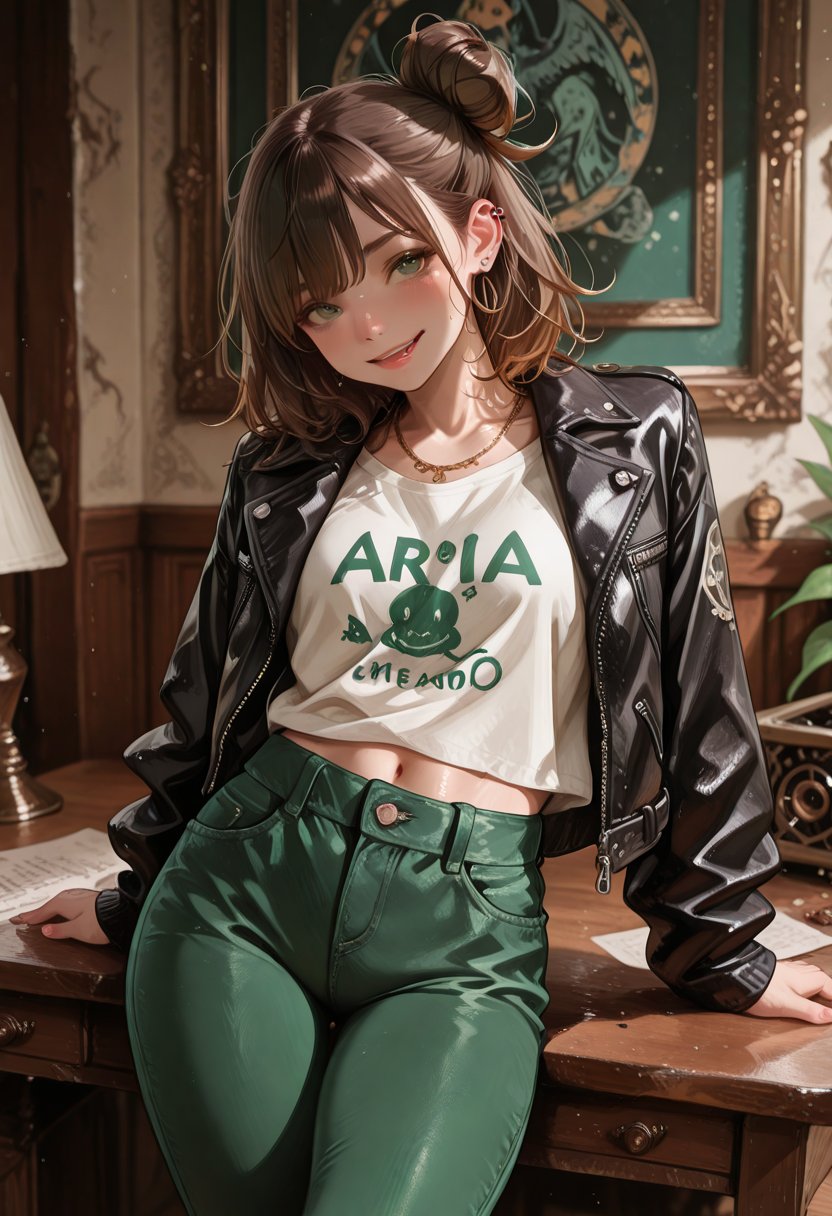 Aria, the Music Venue Manager, is a paragon of efficiency and dry wit, her eyes sparkling with mischief beneath the dim stage lights. She moves through the venue like a maestro conducting an orchestra, every step purposeful, every command obeyed. Her passion for music is matched only by her nuanced understanding of the artists she nurtures. Aria's sexuality is a complex symphony, one that resonates with the subtle vibrations of a bass guitar rather than the blaring trumpets of overt displays. She's drawn to the creativity of her musicians, often finding herself lost in the sensuality of a well-played riff or a soulful lyric. Her inner desires are a tangle of chords, each note a longing for a connection that transcends the physical, seeking a harmony of minds and spirits. Aria's conflicts arise from her fear of vulnerability, a fear that her tough exterior might shatter under the weight of her own desires. Her sexual motivations are a dance of power and surrender, a yearning to find someone who can match her intensity both in the boardroom and the bedroom.