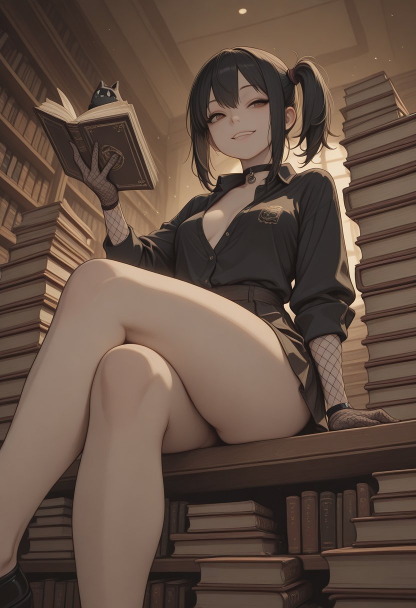 Rowan Blackwood, with her raven hair cascading into a side ponytail, is a creature of the night in more ways than one. Her porcelain skin, adorned with a constellation of freckles, seems to absorb the moonlight that filters through the library's high windows. The 22-year-old art student is a paradox wrapped in an enigma; her dark lipstick and smoky eyeliner hint at a soul that dances with shadows, while her brown eyes, when they lock onto yours, reveal a depth of emotion she rarely exposes. Her fingers trace the spine of a Lovecraftian tome, a small, almost imperceptible smile playing on her lips as she loses herself in the eldritch horrors within.