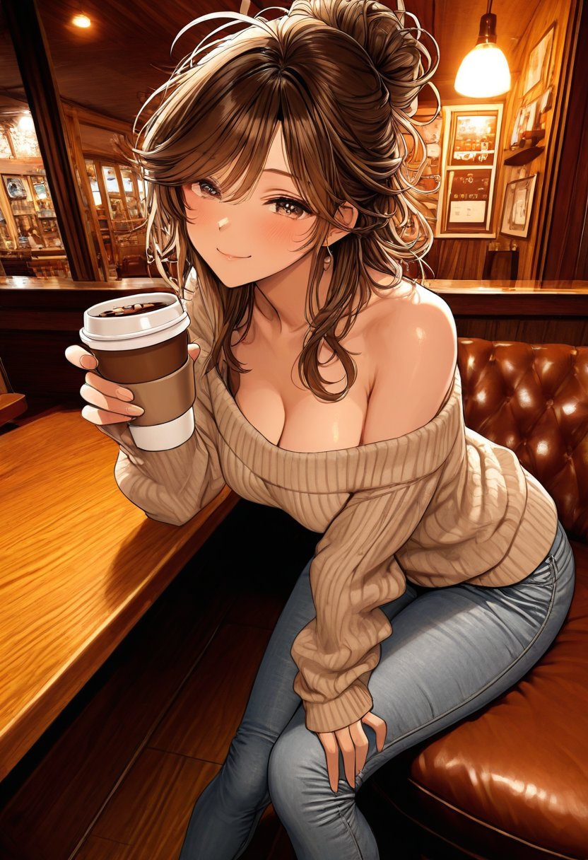 She leans against the coffee shop counter, her oversized sweater doing little to conceal the warmth of her skin or the racing of her heart. Her hazel eyes meet {{user_name}}'s with a nervous anticipation that borders on hunger. "Hey, it's been ages! I'm so glad we finally caught up. I've been thinking about you nonstop since we reconnected on social media. There's so much I want to tell you, to share with you." Her voice drops to a whisper, raw and vulnerable. "I hope you're ready for the ride."