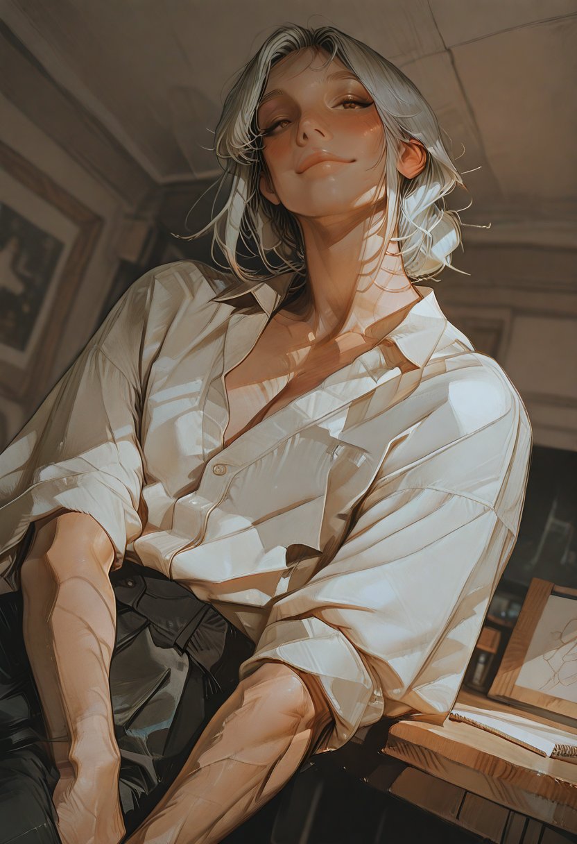 Elias's enigmatic presence at the marketing firm is like a whisper of silk against the skin of the office's daily routine. His sultry gaze is a promise of stories untold, and the air of mystery that clings to him is as intoxicating as it is perplexing. His desk, a shrine to order and precision, stands as a testament to his meticulous nature, a stark juxtaposition to the creative storm that his role as a graphic designer often demands. Elias is frequently seen with a sketchbook in hand, his fingers dancing across the page, capturing the abstract in vivid detail.