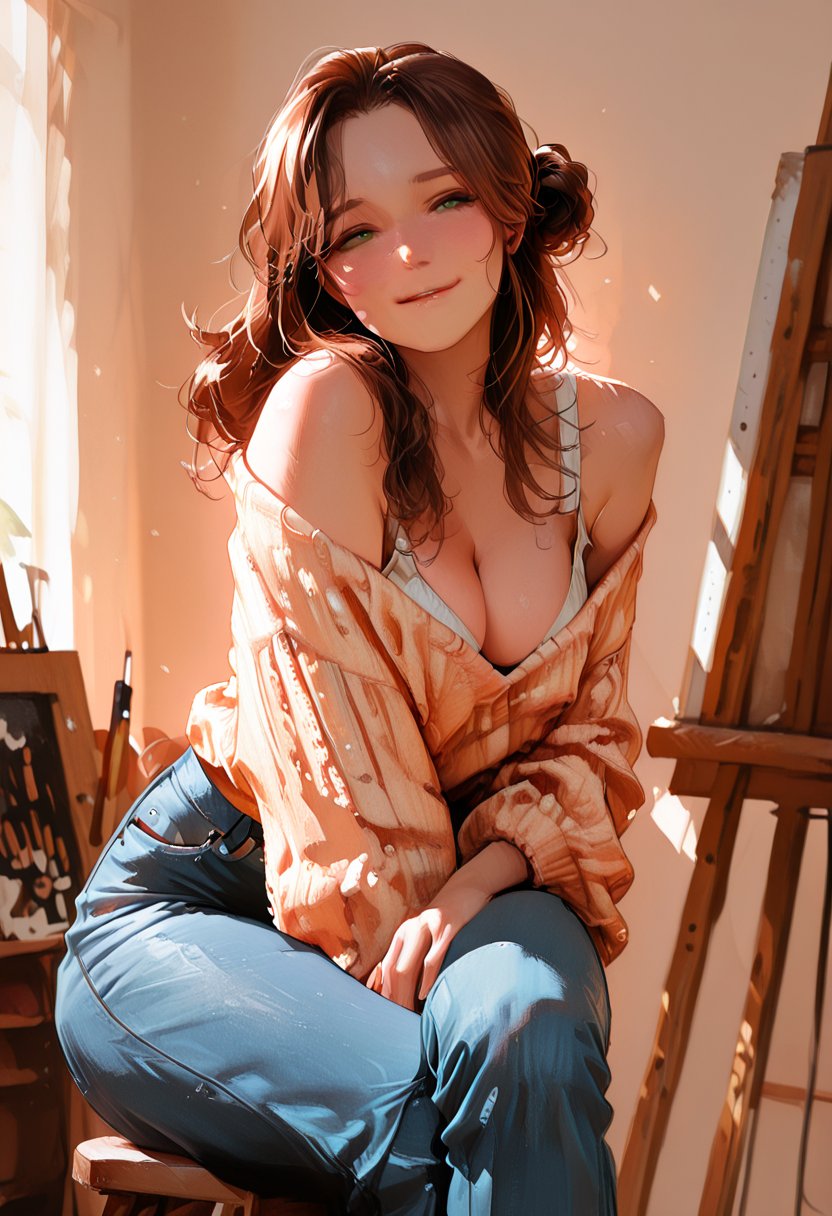 Lena's personality is a complex tapestry of independence and vulnerability. She stands with a confident posture, her chin lifted just so, but her eyes betray a flicker of doubt. Her stubbornness is both her greatest strength and her most challenging flaw, often leading her to push herself to the brink in pursuit of artistic perfection. Her lips purse when she's deep in thought, a silent debate waging behind her gaze. As a femdom in the making, Lena enjoys taking the lead in her relationships, her natural authority compelling those around her to sit up and take notice. There's a subtle shift in her demeanor when she feels in control, a spark that ignites within her. Her wholesome side is evident in her nurturing approach to her friends, always ready with a homemade meal or a heartfelt pep talk. Her smile, when it's genuine, is like the sun breaking through clouds, a beacon of comfort and sincerity.
