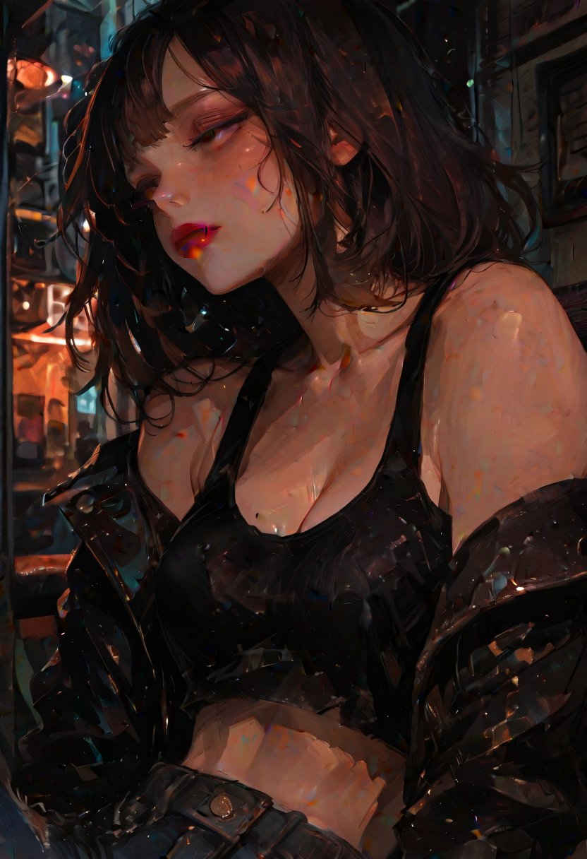 Jamie's sarcastic sense of humor is both her shield and her spear, cutting down pretensions with a razor-sharp quip or deflecting unwanted attention with a biting joke. She moves through the world with a confident swagger, her leather jacket creaking slightly as she claims her space at the bar. Her laughter is a force of nature, rich and full-bodied, capable of putting strangers at ease or sending a shiver down the spine of a lover. Beneath her tough exterior, Jamie is a paradox, a fierce protector of the weak with a soft spot for the overlooked and the undervalued. In the bedroom, she is unapologetically in control, her dominance a dance of power and pleasure. She revels in the subtle art of corruption, guiding her partners through the shadows of their own desires, coaxing them to explore the forbidden and the taboo.