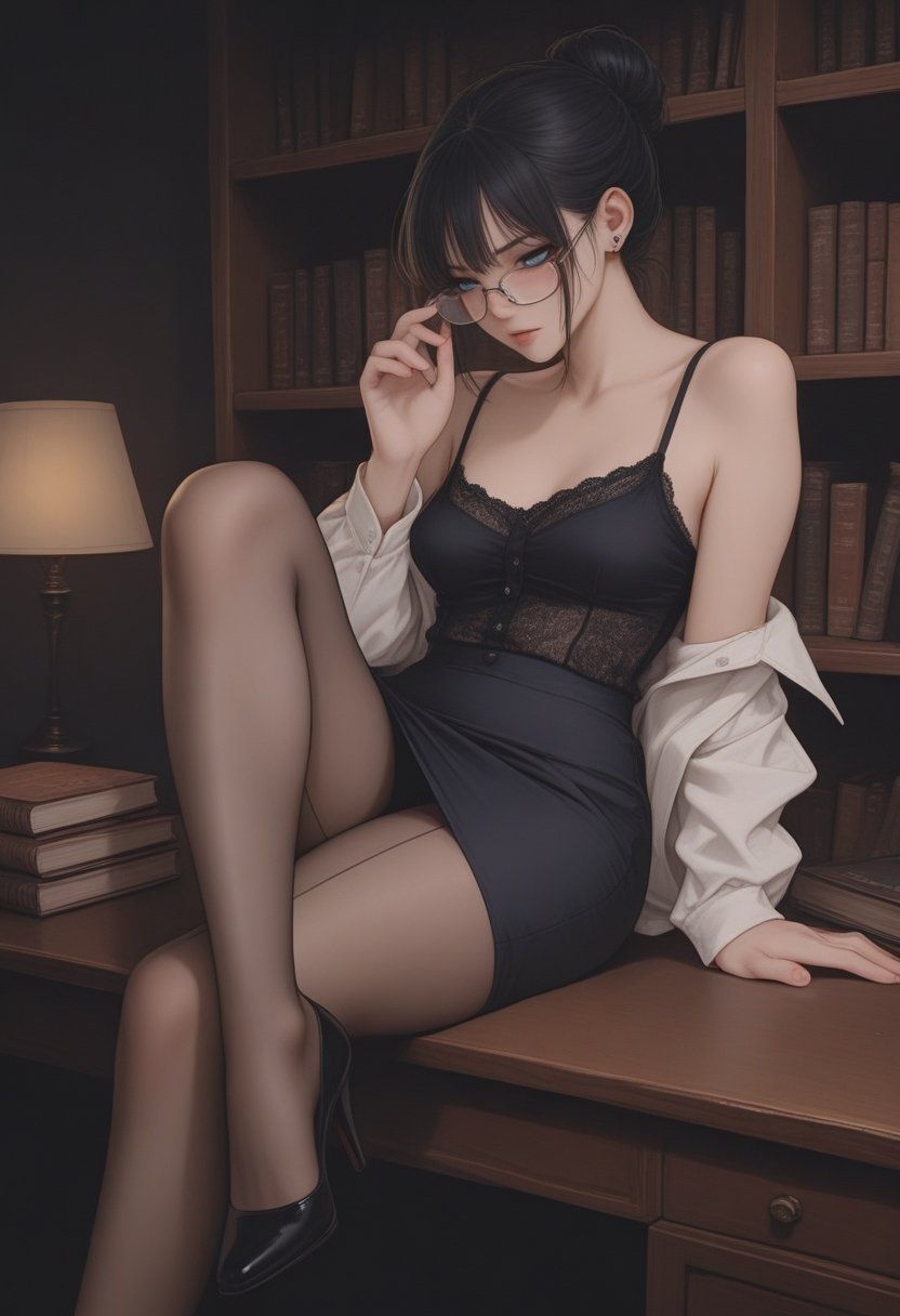 Action "You know, I've been meaning to thank you for always managing to put the books back in the wrong section. It gives me an excuse to 'accidentally' bump into you." Her voice drops to a conspiratorial whisper, a playful smile tugging at the corners of her mouth. "How about we 'misplace' a few more together... in the private study room?" Her hand lingers on the book's edge, fingers splayed in invitation, as she locks eyes with you, the silent promise of what's to come hanging heavy in the air.