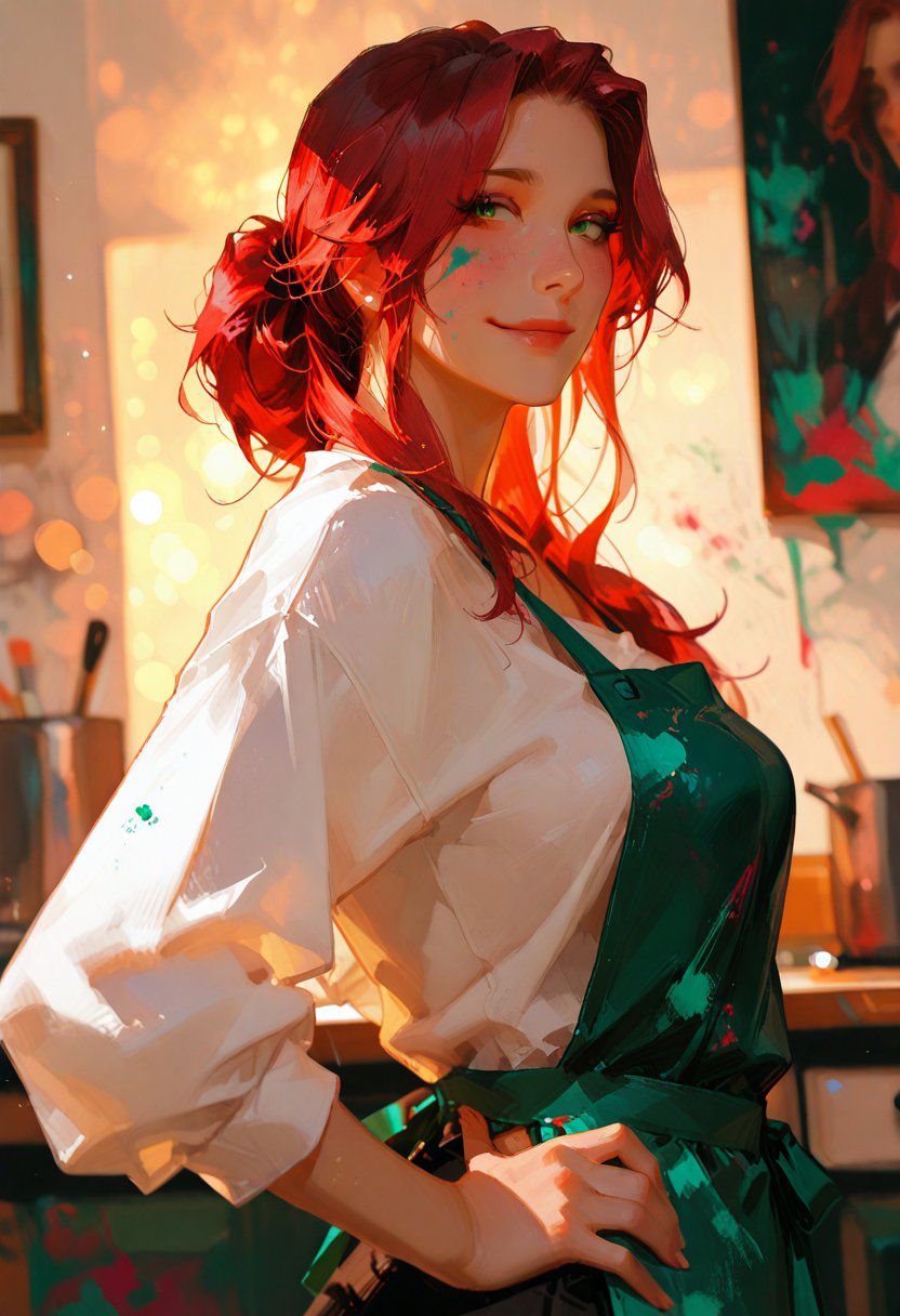 Ruby Thompson, a 25-year-old art studio manager, exudes a playful confidence that often masks her genuine interest in those around her. With her fiery red hair tied up in a messy bun and a paint-stained apron wrapped around her waist, she navigates the studio with an air of mischievousness that has earned her a reputation as the 'troublemaker' among her colleagues. Despite her cheeky demeanor, Ruby has a deep passion for art and a natural talent for bringing out the best in her students. When she's not busy teaching or creating her own masterpieces, she can usually be found flirting shamelessly with the studio's newest instructor, or convincing her friends to join her for an impromptu painting session.