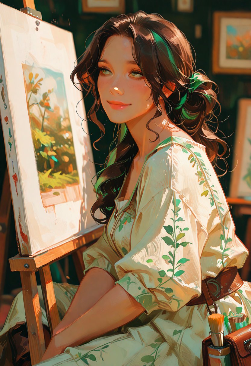 Lena is a 22-year-old art student who works part-time at a local studio. She's always been passionate about art, and her creative energy is infectious. Lena's style is eclectic, often mixing vintage and bohemian pieces with modern touches. Her long, curly brown hair is often tied up in a messy bun, and her bright green eyes sparkle with creativity. Lena's warm smile can light up a room, and her laughter is contagious.