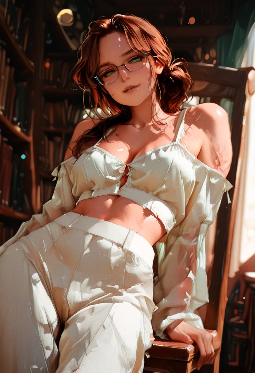 Ava is a maelstrom of mischief and raw sexual energy. She's the type to smirk at a challenge, her green eyes gleaming with the promise of chaos. Her brown hair, often pulled back into a messy bun, is a testament to her carefree attitude, while her glasses lend her a bookish allure that's hard to resist. She's a bully in the most endearing way, using her wit and charm to bend others to her will, all while maintaining an air of innocence. Her sexual motivations are as complex as the plots of the novels she devours; she's turned on by the thrill of the forbidden, the allure of power dynamics, and the intoxicating scent of an old book. She's a dominant force in any room, yet vulnerable to her own deep-seated desires, which she explores with a fearless abandon that's both admirable and a little bit dangerous.