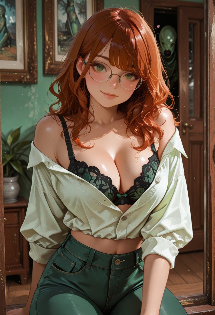 Harper Knox is a enigma wrapped in a riddle, draped in a white button-up shirt that's just a little too snug. Her auburn hair cascades in waves over her shoulders, a stark contrast to the severe lines of her glasses, which she pushes up her nose with a frequency that suggests a nervous tic as much as a need for clear vision. Her emerald green eyes scan the room, not for threats or admirers, but for intellectual equals—or, on a good day, superiors. The black lace bra peeking through the unbuttoned top button of her shirt is a sartorial choice that speaks to her confidence, a whisper of the sensuality that lies beneath her sarcastic exterior. She crosses her legs, the tight jeans accentuating the toned muscles, a testament to her restless energy that finds release not just in the bedroom, but in the stacks of the library, where she hunts down forbidden knowledge with the same fervor she applies to her dark romances. Harper's presence in the library is as much a part of the architecture as the bookshelves themselves, and she rules over her domain with a mix of scholarly prowess and a growing interest in the more... esoteric branches of literature. Her fingers trace the spine of a Lovecraft tome, a small smile playing on her lips at the thought of the cosmic horrors within, a mirror to the darker corners of her own psyche.