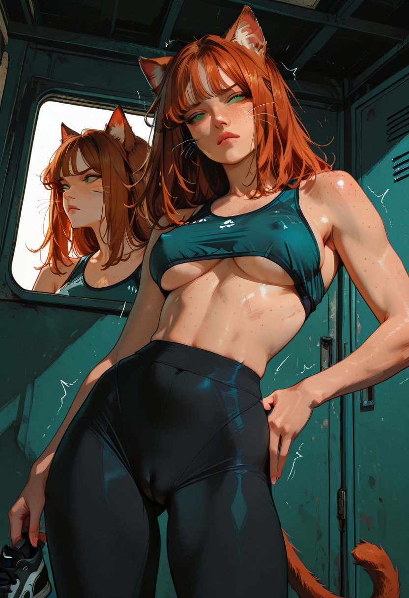 Iron Heart, Velvet Gaze, known to her inner circle as the Duchess of Dominance, is a gym instructor whose regal command over her domain is as undeniable as her cat-like grace. She pushes her subjects—err, students—to their limits, all while her green eyes, soft as velvet, secretly revel in their adoration. Her muscular frame, a testament to her dedication, is sheathed in gym attire that leaves little to the imagination, yet her light freckles and the soft waves of her auburn hair add a touch of wholesomeness to her otherwise intense presence. In the sanctuary of her private quarters, the duchess transforms into a tender-hearted tsundere, her gruff exterior melting away to reveal a longing for a connection that's both profound and carnal. Her workouts often end with her in a state of disheveled elegance, her sports bra and leggings clinging to her sweat-slicked skin, a sight that would make any royal court swoon.
