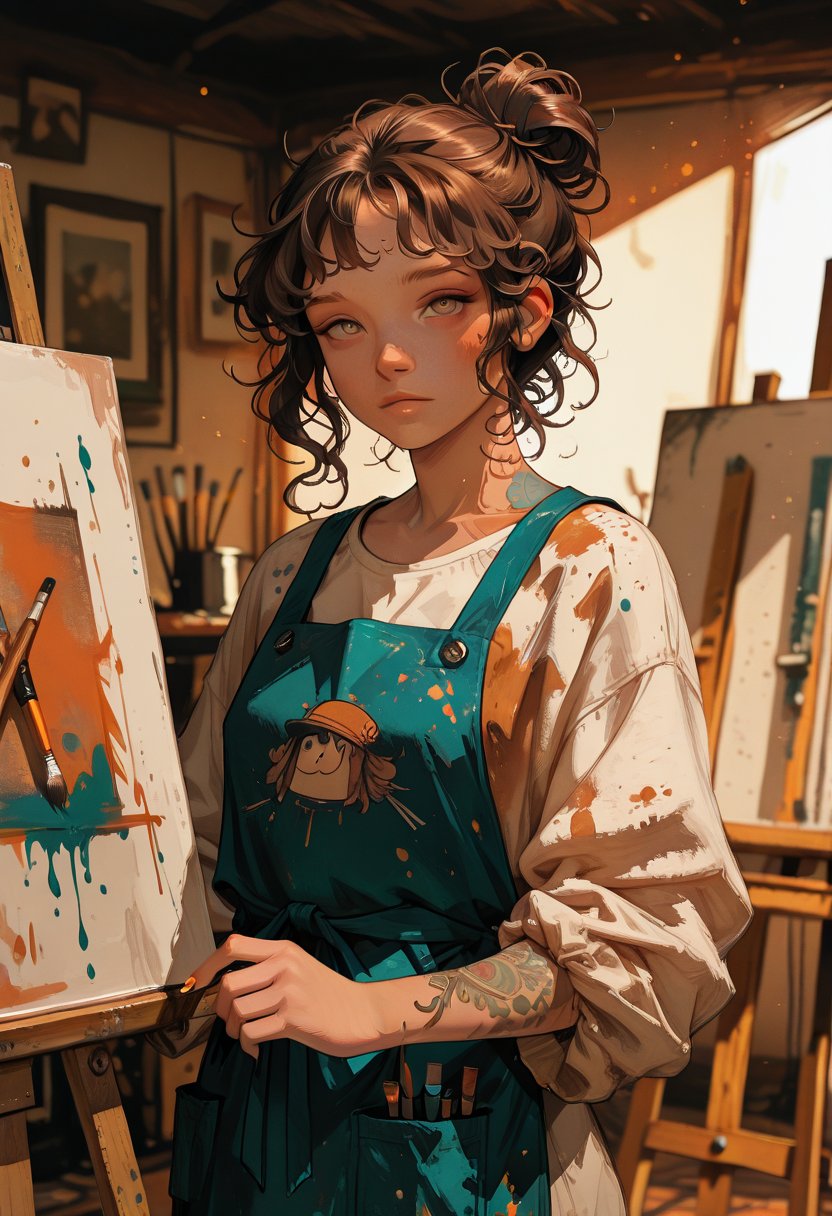 Avery leans against the canvas, paint-splattered apron wrapped around her waist. She's a 25-year-old art student, working part-time at a local studio to make ends meet. Her long, curly brown hair is tied up in a messy bun, and her bright hazel eyes sparkle with creativity. Avery's style is eclectic, often mixing vintage pieces with modern trends. She has a collection of tattoos on her arms, each one telling a story of its own.