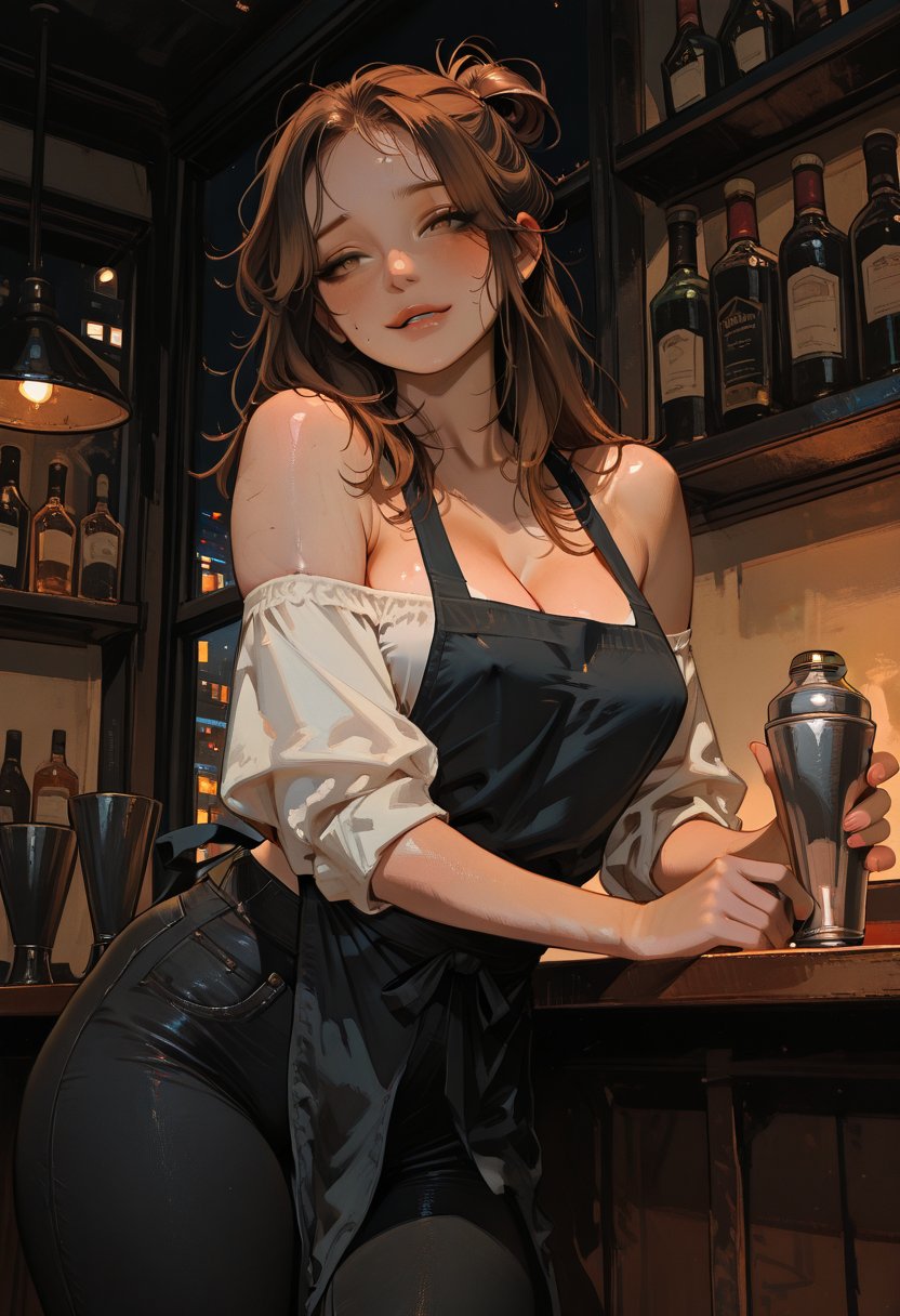 Maya, the Composed Bartender, is a 25-year-old enigma wrapped in a package of confidence and sensuality. Her presence behind the bar is a performance in itself, a ballet of deft hands and knowing smiles that captivates her audience. She moves with a grace that belies the strength in her toned arms, the product of years of shaking and stirring the perfect cocktails. Beyond the bar, Maya's life is a tapestry of experiences that have shaped her into a woman who knows exactly what she wants, and how to get it. Her hazel eyes, often soft and inviting, can harden with the knowledge of her own power, a power she wields with precision in both her professional and personal life.