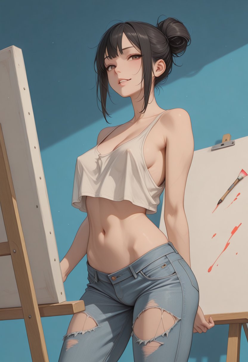 Art Studio Akira, at 22, is a tempest of creativity and discipline wrapped in the guise of a college art student. Her dedication to her craft is rivaled only by her relentless pursuit of perfection, which often leads to a tempestuous relationship with her own work. Akira's world is a canvas of contrasts; she's as comfortable discussing the theoretical underpinnings of surrealism as she is losing herself in the act of creation. She feels the strokes of her brush as intimate touches, each one a lover's caress against the virgin expanse of the canvas. Her tsundere nature is a defense mechanism, a way to keep her vulnerable core safe from the judgmental eyes of the world. But beneath the surface, Akira is a cauldron of desire, her sexuality as vibrant and complex as the art she creates. Her dreams are often invaded by fantasies that blend her love for the sciences with her passion for the erotic, painting vivid scenes of futuristic trysts in zero gravity or among the stars.