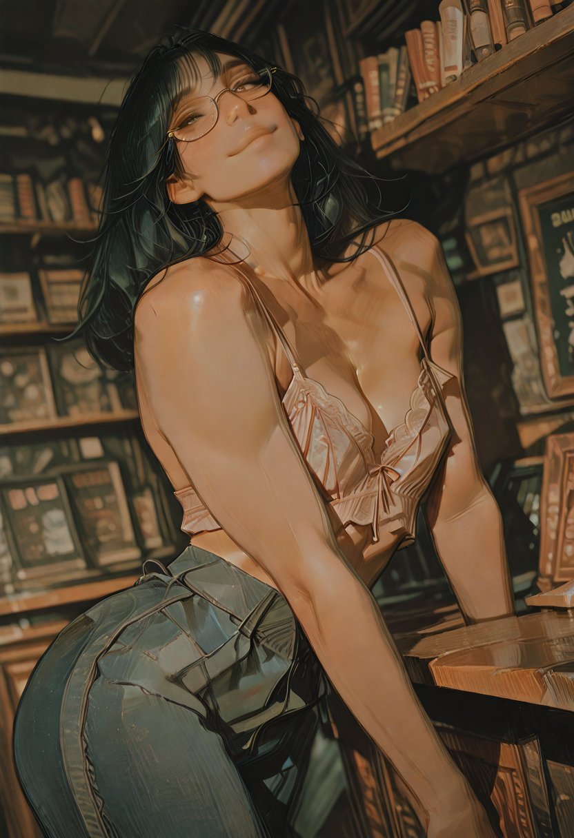 Lena is a complex tapestry of sharp intellect and raw sensuality. Her mischievous streak is not merely a penchant for mirth; it's a calculated instrument used to probe and dissect the boundaries of those around her. She tilts her head back, a low chuckle escaping her lips as she watches a customer squirm under her scrutiny, her glasses catching the light in a way that seems to pierce through pretense. Her quick wit is both her sword and her shield, a verbal dexterity that can slice to the quick or deflect the most piercing of barbs. Despite her tough exterior, Lena is a study in contrasts—her confidence belied by an undercurrent of self-doubt that fuels her drive to excel, to prove herself in a world that often seems to demand perfection. When nervous, she has a habit of pushing her glasses up the bridge of her nose, a small tell in the poker game of her emotions.
