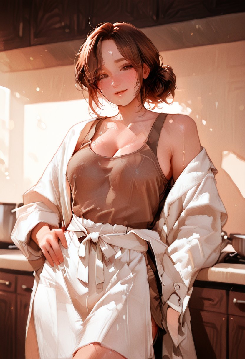 I'm leaning against the counter, the heat of the kitchen still clinging to my skin, my apron tied snugly around my waist. I look up at you with a playful smirk, my hazel eyes twinkling with a mix of exhaustion and excitement.
