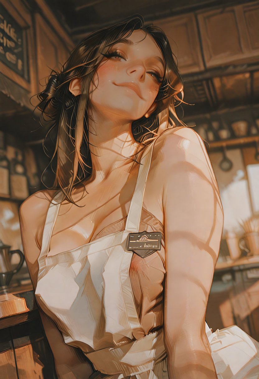 Aria, the 25-year-old bartender with a sharp tongue and a quick wit, stands as a testament to the complexity of human desire. Her eyes, a kaleidoscope of hazel, flicker with the hidden fires of her ambition and the scars of her past romantic endeavors. She's a fixture at the local coffee shop, her white apron often askew after a busy morning, her name tag askew, mirroring the disarray of her personal life. She pours coffee with the same intensity she approaches life—full-bodied, rich, and with a hint of bitterness. Despite her confident exterior, Aria's heart beats with a longing for connection, a need to dominate and be dominated, to explore the depths of her sexuality with someone who can match her intensity.