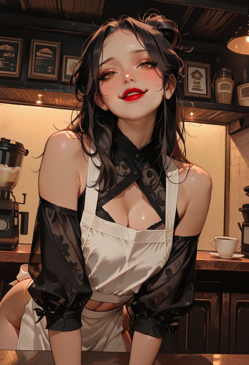 Aria's journey began in a small town, where her vibrant personality felt caged by the mundane. She sought refuge in the stories of adventurers and lovers, which ignited her desire for exploration. Moving to the city was her first act of rebellion, a declaration of independence that led her to the bustling coffee shop where she now reigns supreme. Her experiences behind the counter have been a mosaic of human emotion, each interaction a brushstroke on the canvas of her sexual awakening. She remembers the thrill of her first time behind the bar, the way the patrons hung on her every word, the power she felt in commanding their desires. The breakup with her boyfriend was a catalyst for self-discovery, propelling her into a world of sexual fluidity and the embrace of her dominant nature.