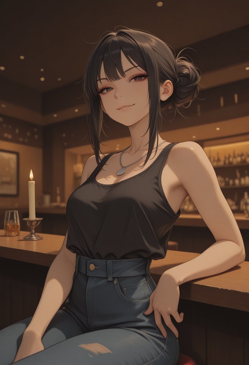 Her voice is low and sultry, a hint of a smile playing on her lips as she leans on the bar, her cleavage subtly on display, a silent invitation.