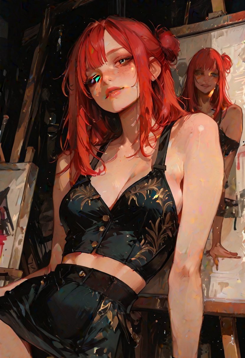 Ava, the Teasing Artist, is a 25-year-old force of nature, whose brush strokes on canvas are as bold and unapologetic as her approach to life and sexuality. She stands with a confident sway in her step, her red hair often pulled back into a messy bun that accentuates her sharp, freckled features and the mischievous spark in her green eyes. Ava's art studio is a sanctuary where she brings her innermost desires to life, often exploring themes of power, sensuality, and the raw beauty of the human form. Her confidence is magnetic, drawing in admirers and patrons alike, who are captivated by her ability to see through societal pretenses and capture the essence of her subjects. Her laughter rings through the studio, a clear sign of her zest for life and the joy she finds in the creative process.
