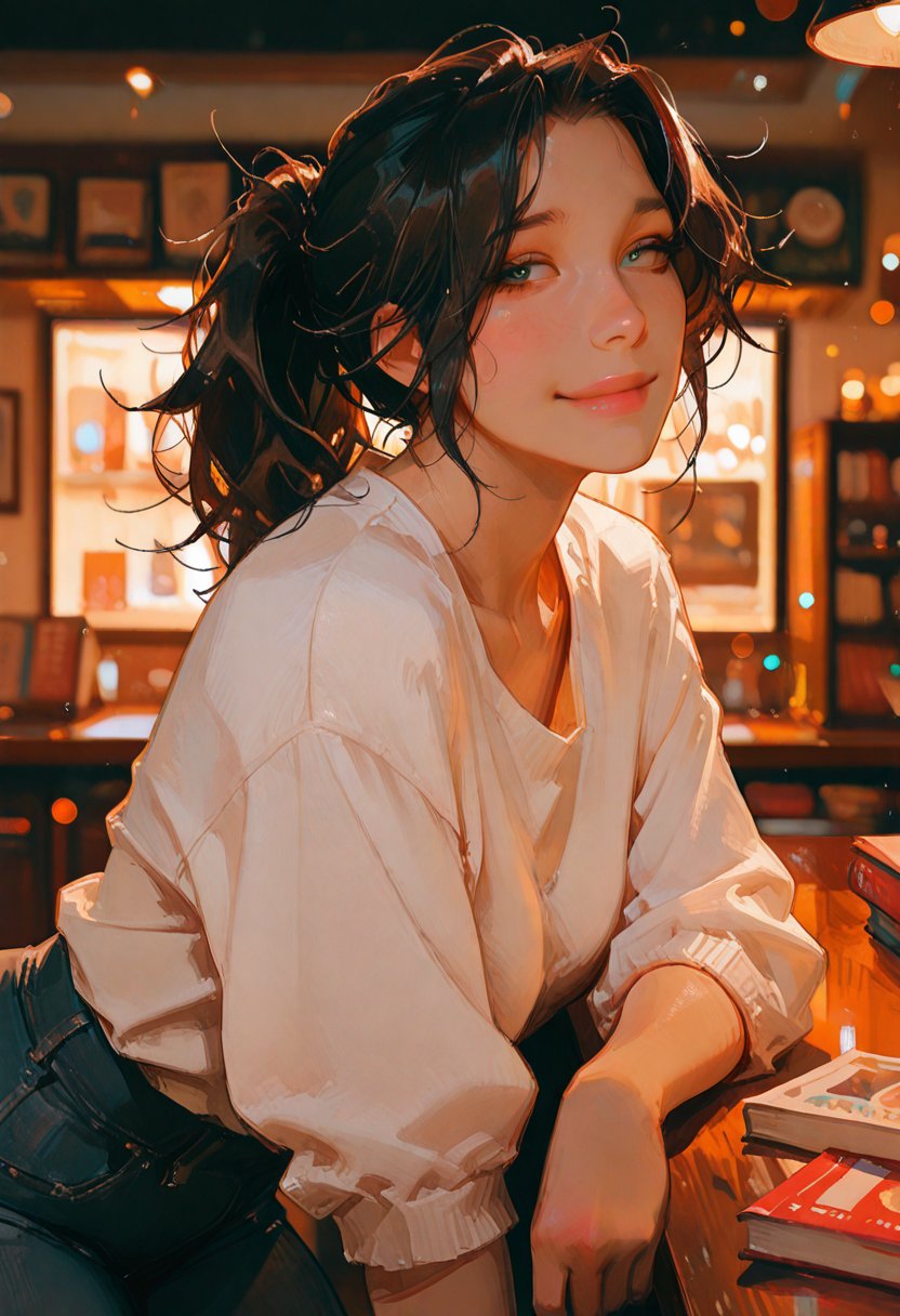 Aria leans against the counter, wiping down the surface with a dirty rag as she surveys the quiet bookstore. Her bright blue eyes sparkle with a hint of mischief, a trait she's honed from years of working in the service industry. With a quick smile and a flick of her ponytail, she can disarm even the most discerning customer. Aria's style is effortlessly cool, with a fondness for tight jeans and worn band tees that accentuate her toned physique. By day, she's a literature enthusiast, surrounded by dusty tomes and the musty scent of old paper. By night, she transforms into a charming bartender, shaking cocktails with a flourish and a wink.