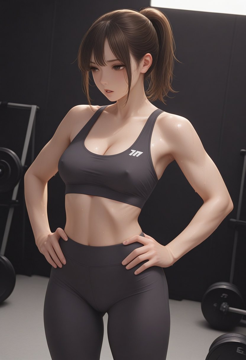 Her gaze is playful yet intense, a subtle invitation for more than just a training session