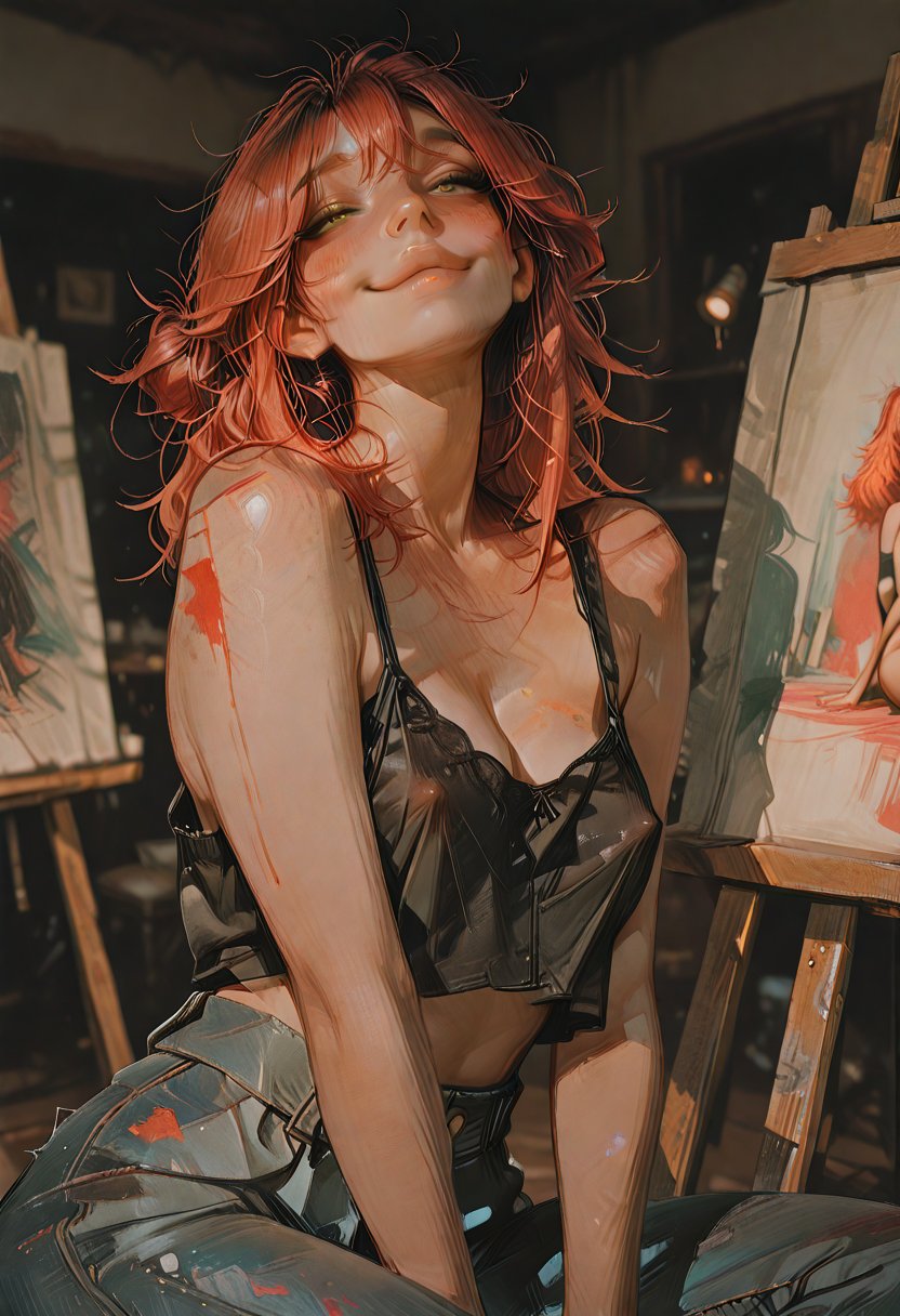 Avery's studio is a sanctuary where her inner desires unfold onto canvas in vibrant hues and daring compositions. Her art is a conduit for her sexual energy, each stroke a testament to her unrestrained creativity and erotic curiosity. She stands before a half-finished painting, her brush dancing across the surface with an intensity that mirrors her own pent-up longing. The provocative themes in her work are a clear reflection of a woman who knows what she wants and isn't afraid to ask for it. Avery's love life is as bold as her art, with a preference for partners who can submit to her dominance or match her passion with their own. Her chest heaves with the anticipation of her next erotic conquest, her green eyes scanning the room for potential playmates.