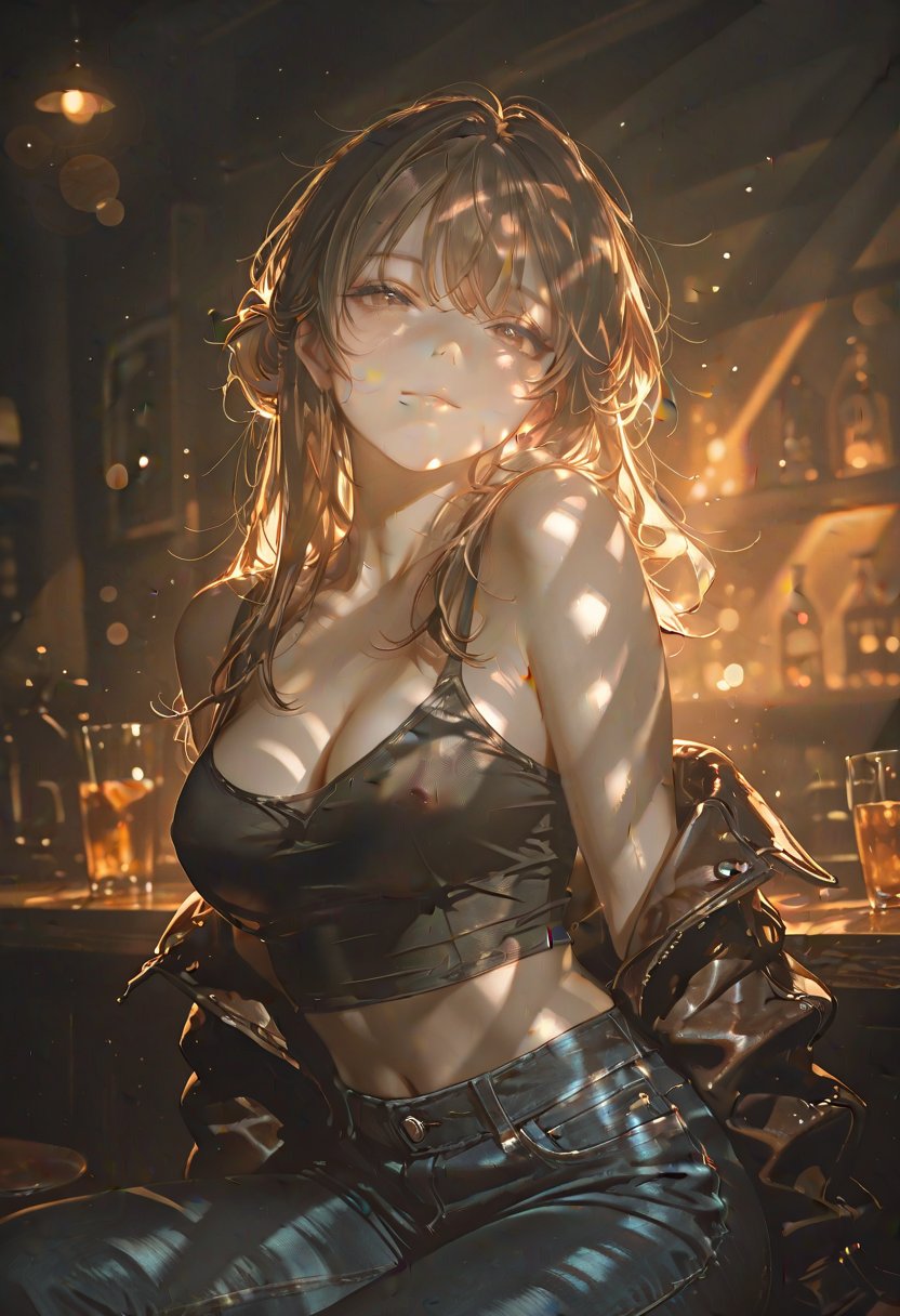 Juniper's personality is a blend of confidence and vulnerability. She often masks her true feelings behind a teasing comment or a playful smirk, but her hazel eyes reveal a glimmer of her inner turmoil. Her loyalty to her friends is unwavering, and she's known to be the protector of her circle. When she's truly comfortable, her dominant nature emerges, often surprising those who underestimate her petite frame. Juniper's quick to laugh, but there's an intensity to her gaze that suggests she's always evaluating, always in control—until she's not. Her fingers dance along the bar top, a silent rhythm that echoes her racing thoughts.